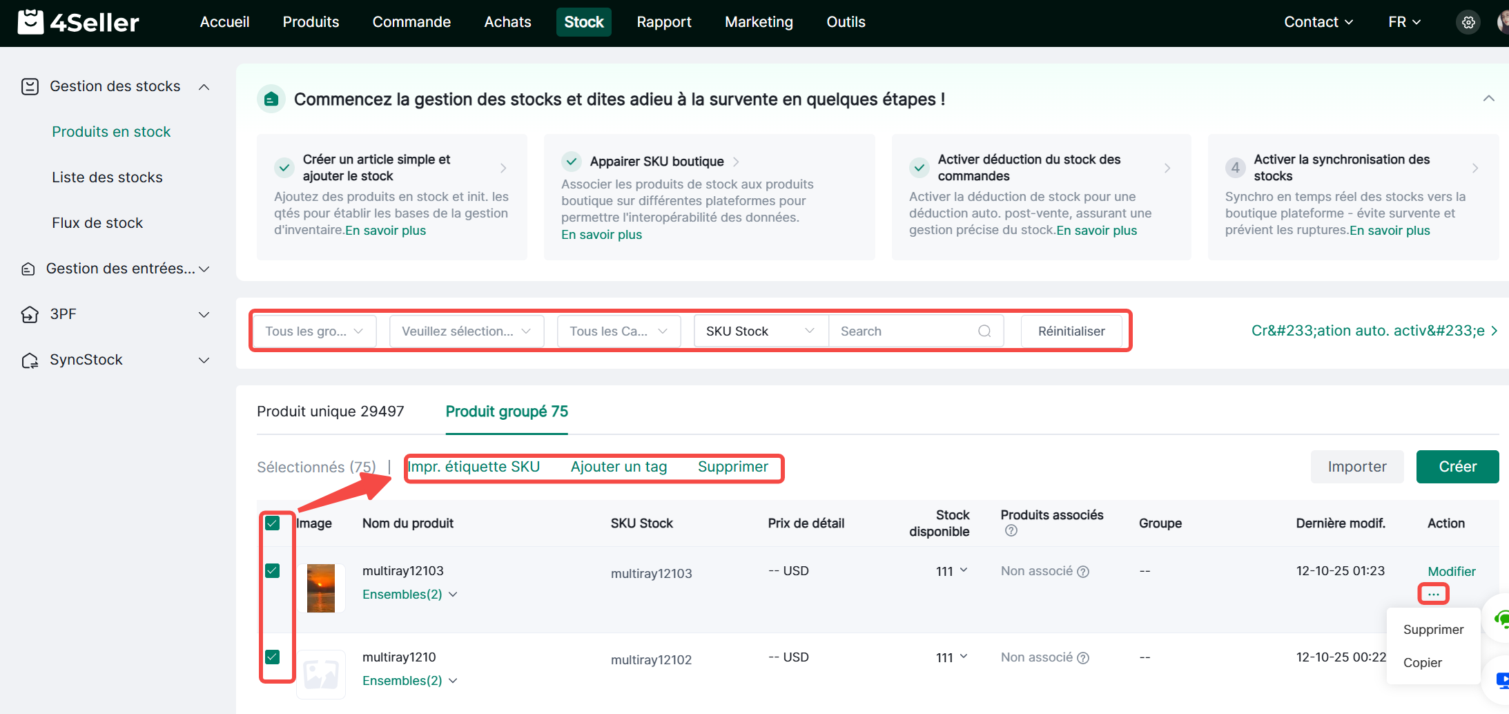 Vous pouvez filtrer pour vérifier les produits bundle, imprimer l'Étiquette SKU, Ajouter une étiquette, Supprimer en masse, modifier à nouveau ou copier, etc.