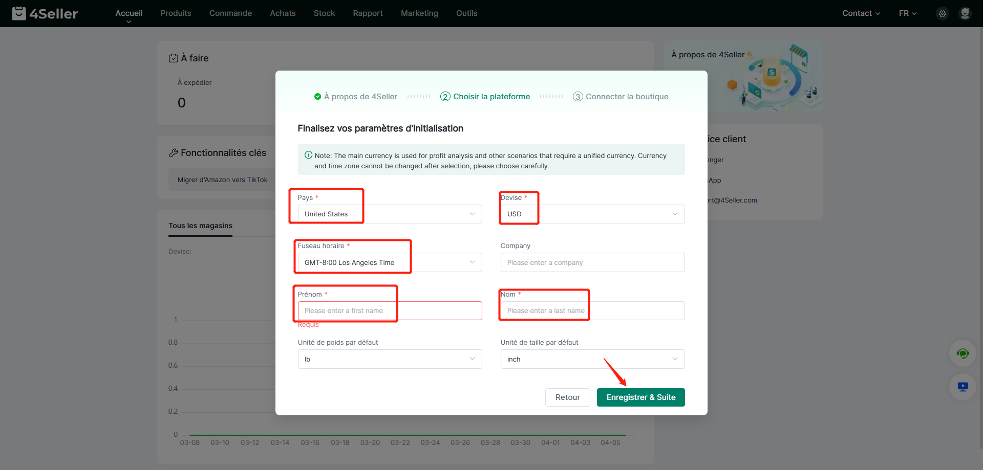 ④ Renseignez les informations requises : Pays, Devise, Fuseau horaire, Prénom et Nom → Cliquez sur Enregistrer & Suivant ⑤ Sélectionnez le logo de la plateforme e-commerce à connecter.