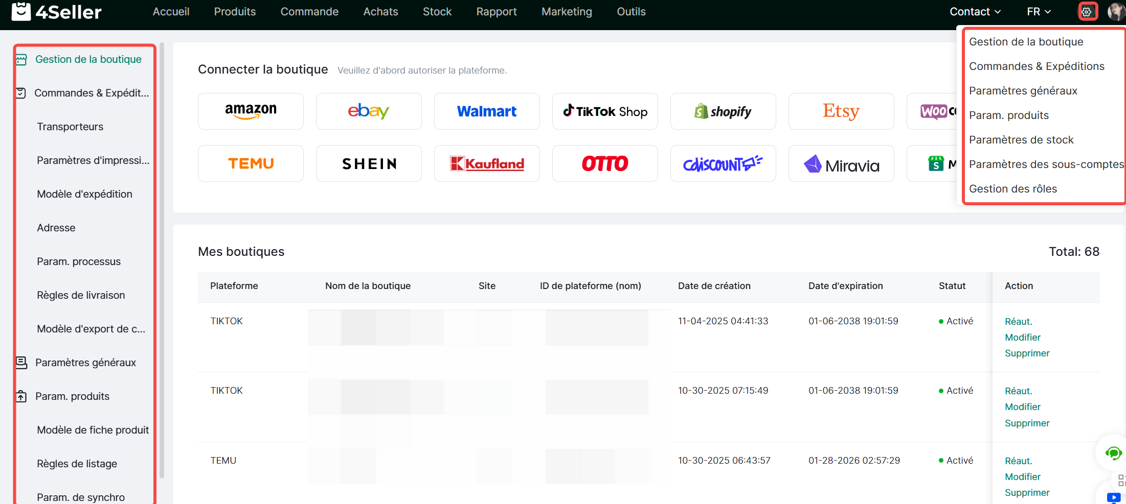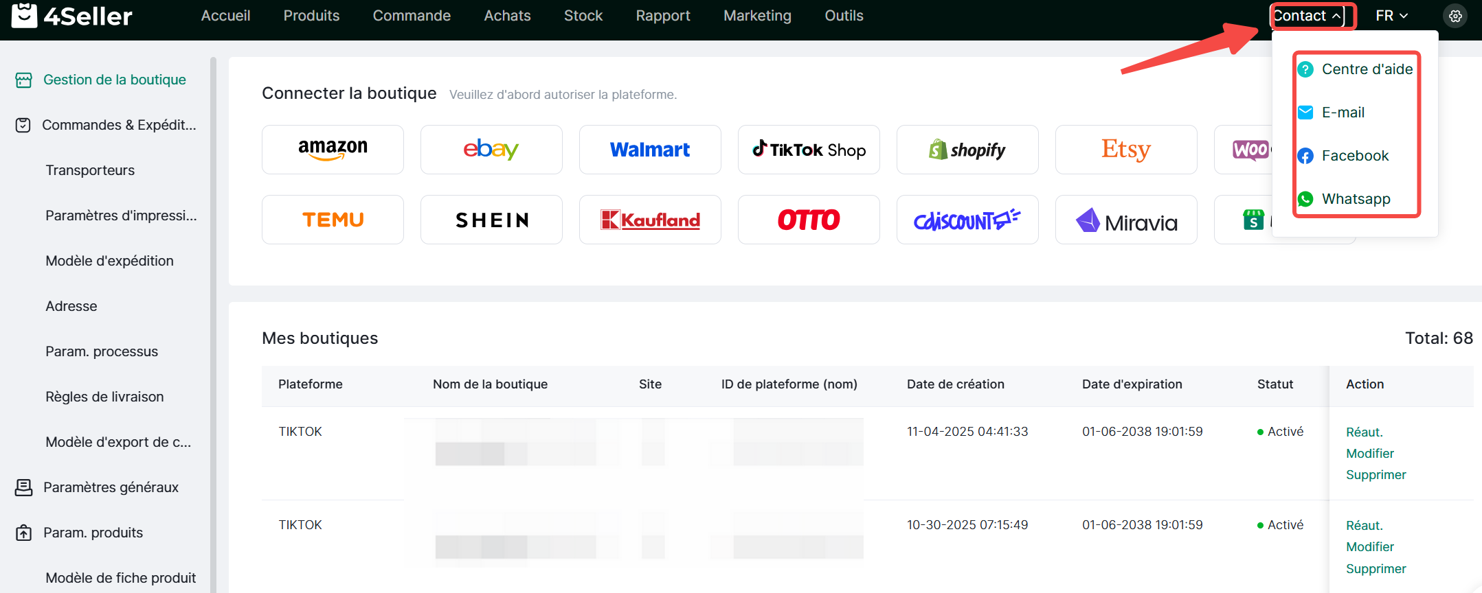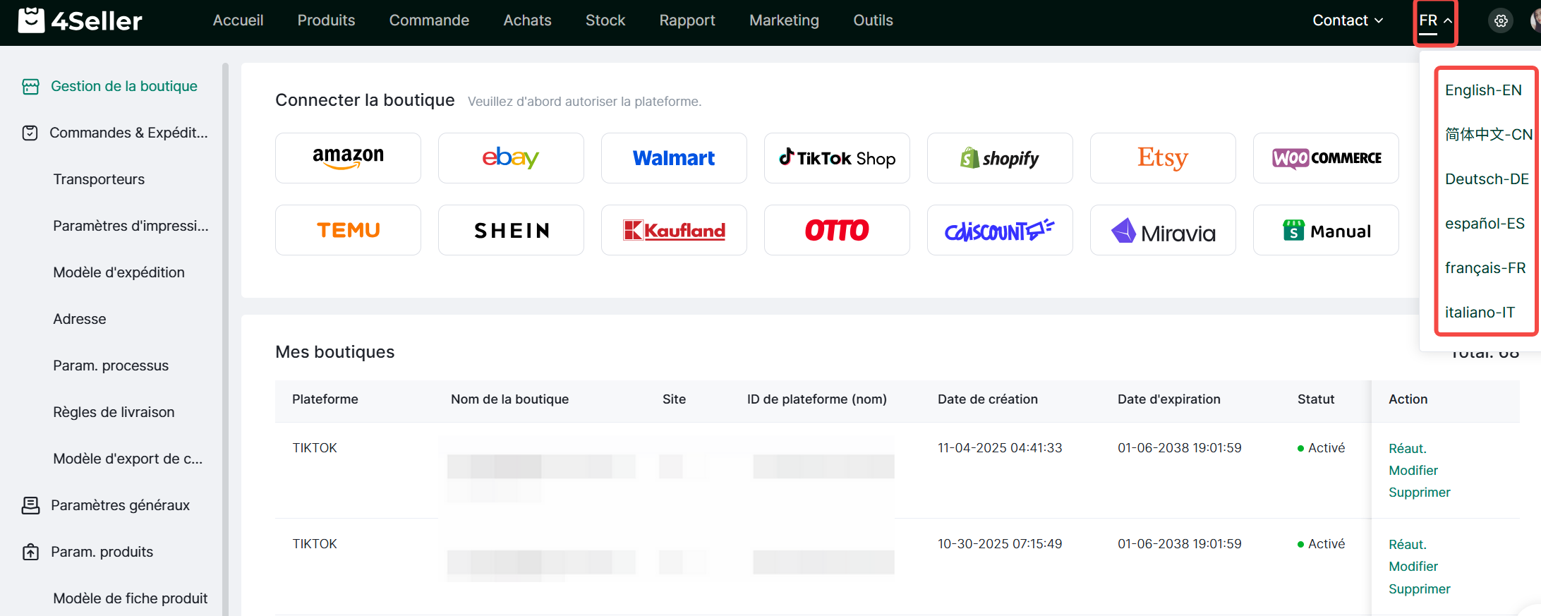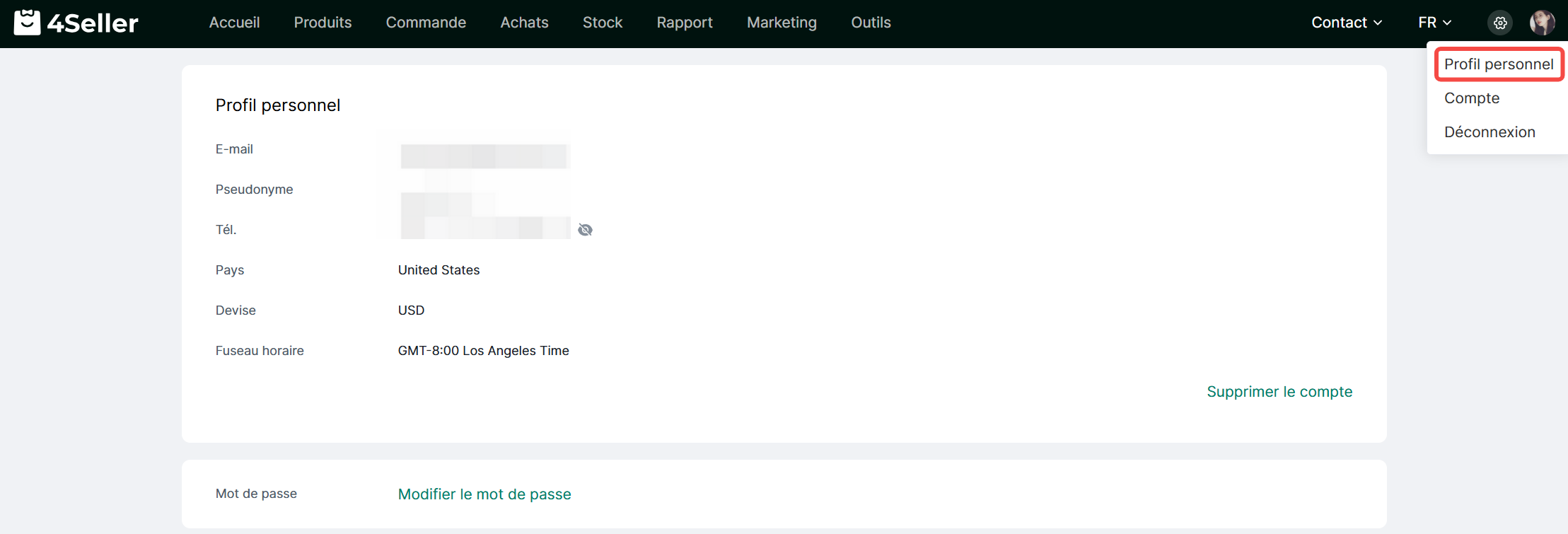 Après avoir complété ces 5 étapes, votre compte 4Seller est activé avec succès. ⑥Cliquez sur l'icône de profil dans le coin supérieur droit pour accéder aux détails de votre compte (votre adresse e-mail sert de nom d'utilisateur 4Seller), où vous pouvez mettre à jour votre numéro de téléphone portable et votre mot de passe. ⑦Appuyez sur l'icône des paramètres dans le coin supérieur droit pour accéder rapidement aux modules pertinents. ⑧Utilisez la flèche déroulante pour sélectionner la langue d'interface de votre choix. ⑨Si vous rencontrez des problèmes lors de l'utilisation, consultez le Centre d'aide ou contactez le service clientèle.