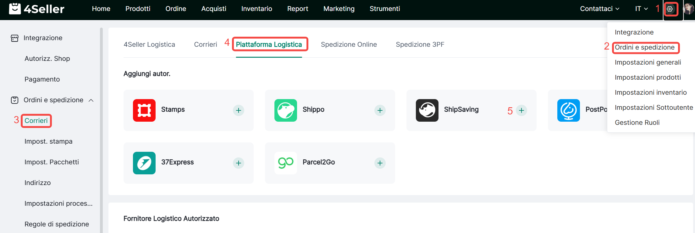 ① Clicca sull'icona Impostazioni >Ordini e spedizizone> Seleziona "Corrieri" > Piattaforma Logistica> Clicca su "Aggiungi account"