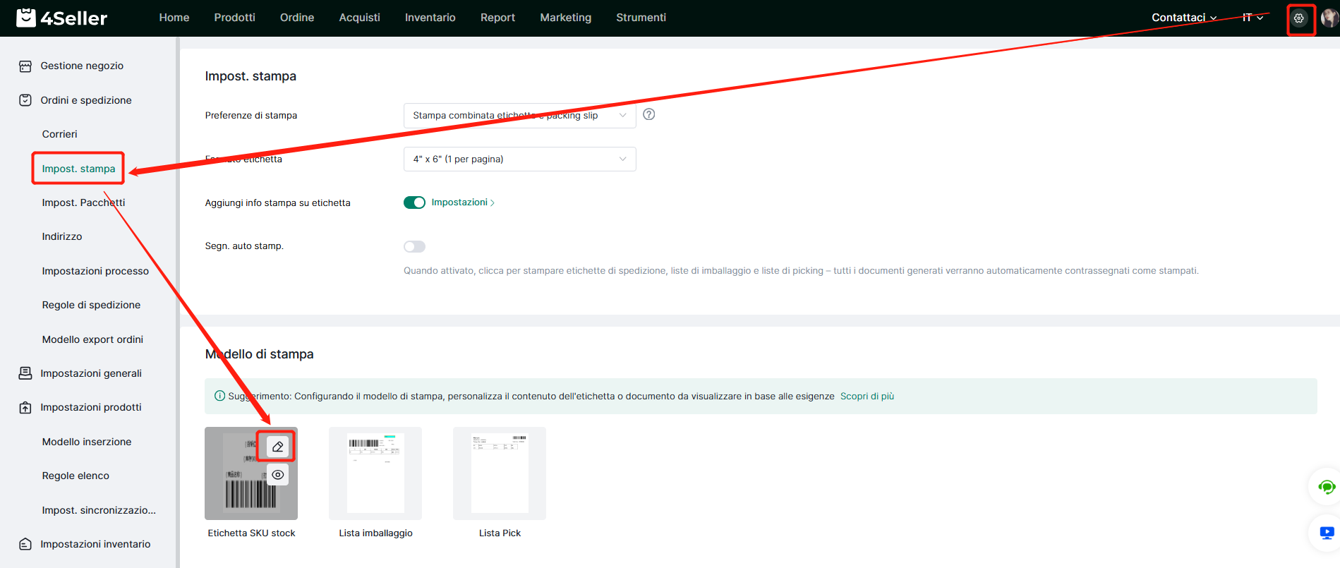 Attualmente, 4Seller supporta la personalizzazione del modello di stampa per le Etichette SKU, permettendo di adattare i contenuti in base alle esigenze operative. Segui questi passaggi: