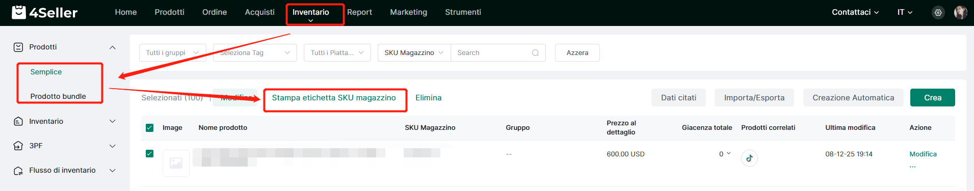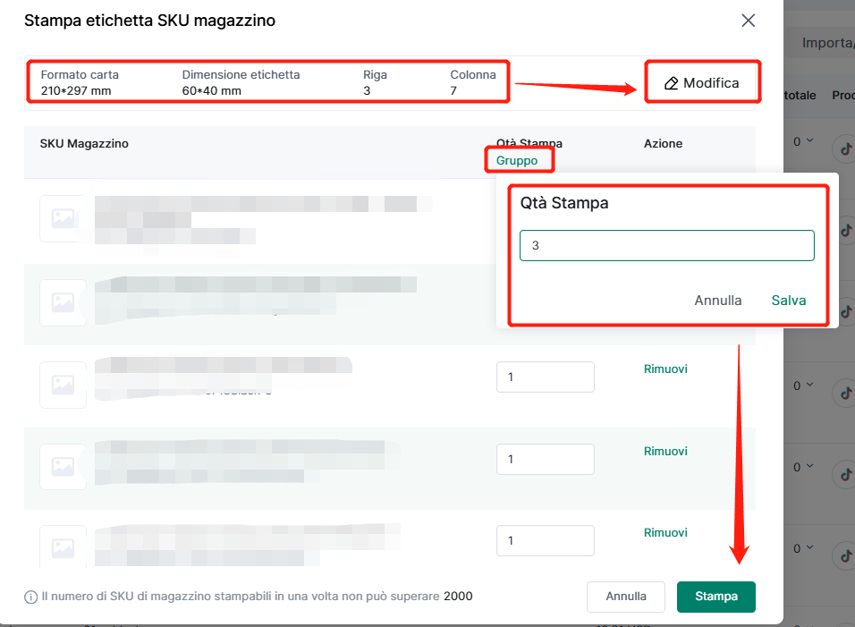 Nella sezione Inventario, seleziona SKU singoli o multipli (max 2000 per stampa).