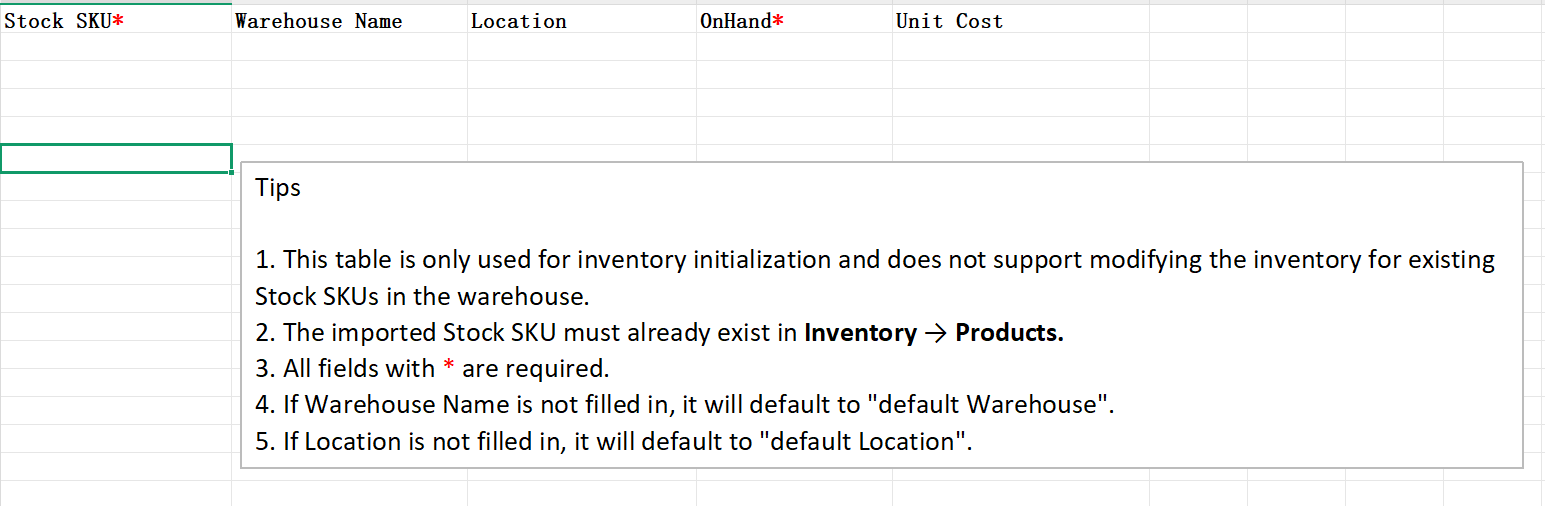 Prima di aggiungere informazioni sull'inventario SKU e regolare l'inventario, è necessario impostare in anticipo le informazioni su magazzino e ubicazione.