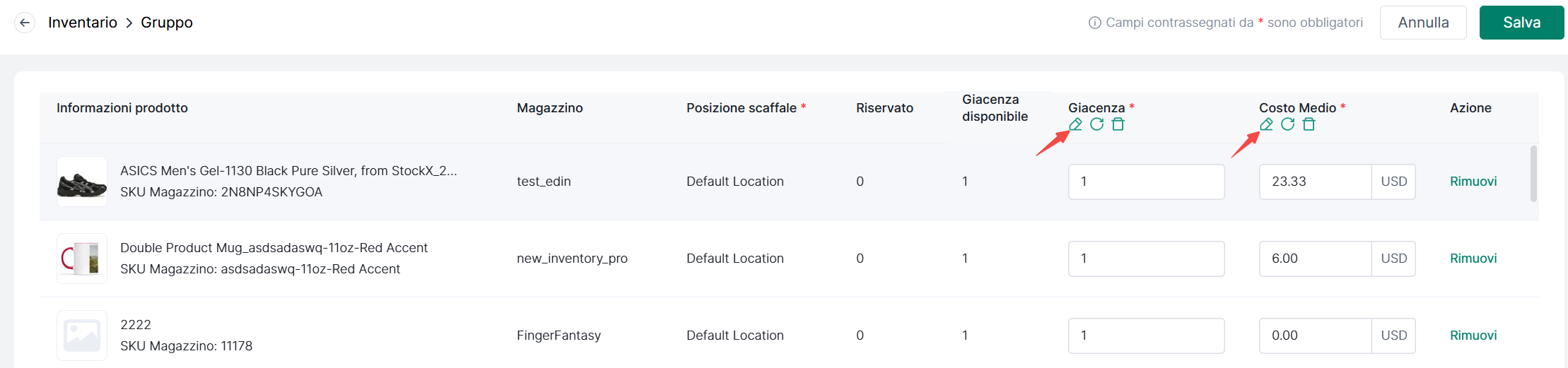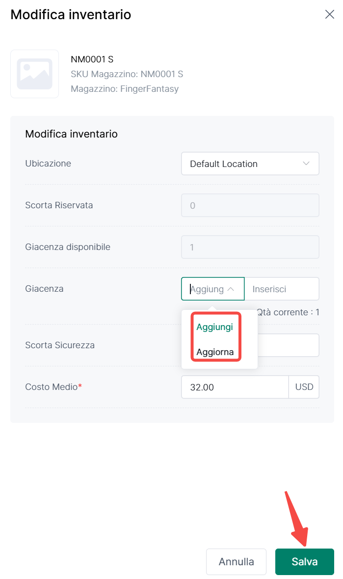 ② Modifica ubicazione, scorte a magazzino e costo medio come desideri> Clicca Salva