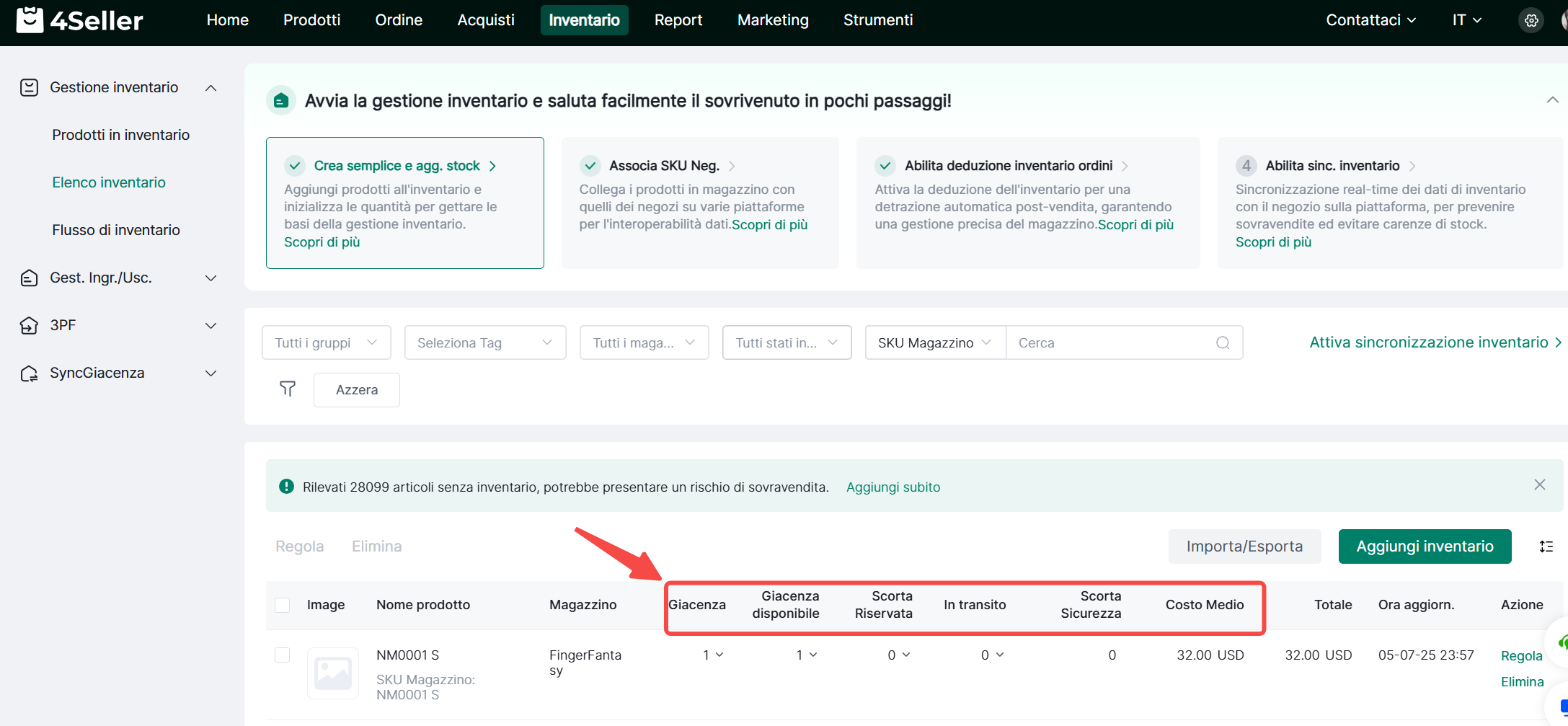 Reserved (Riservato): Quantità inventario già allocata agli ordini. Quando un ordine viene sincronizzato su 4Seller, il sistema blocca l'inventario per quell'ordine. L'inventario bloccato non verrà allocato ad altri ordini.