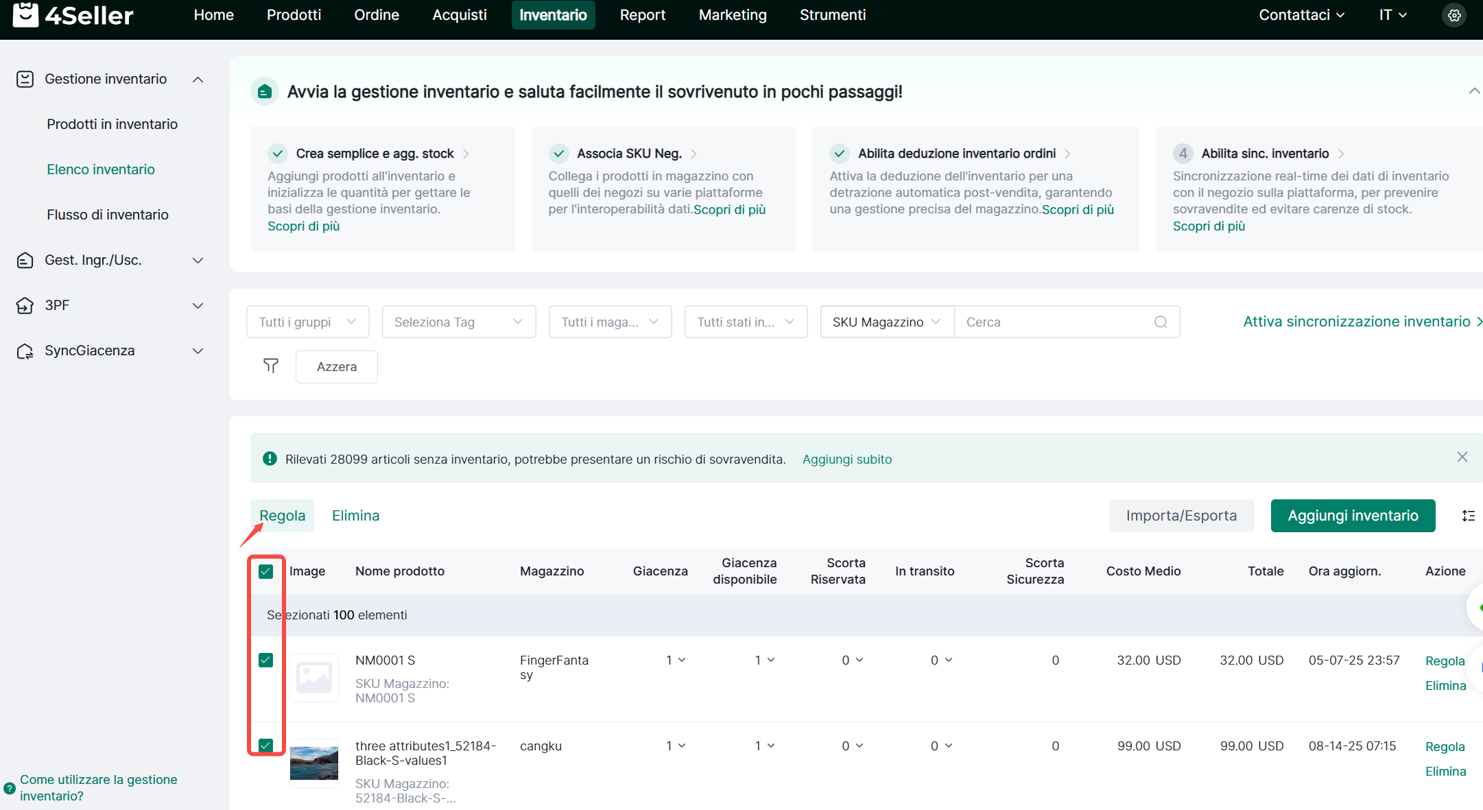 ① Seleziona più SKU per aggiungere inventario> Clicca Regola per modificare in blocco tutte le informazioni SKU inclusi Quantità a Magazzino e Costo Unitario nell'elenco.