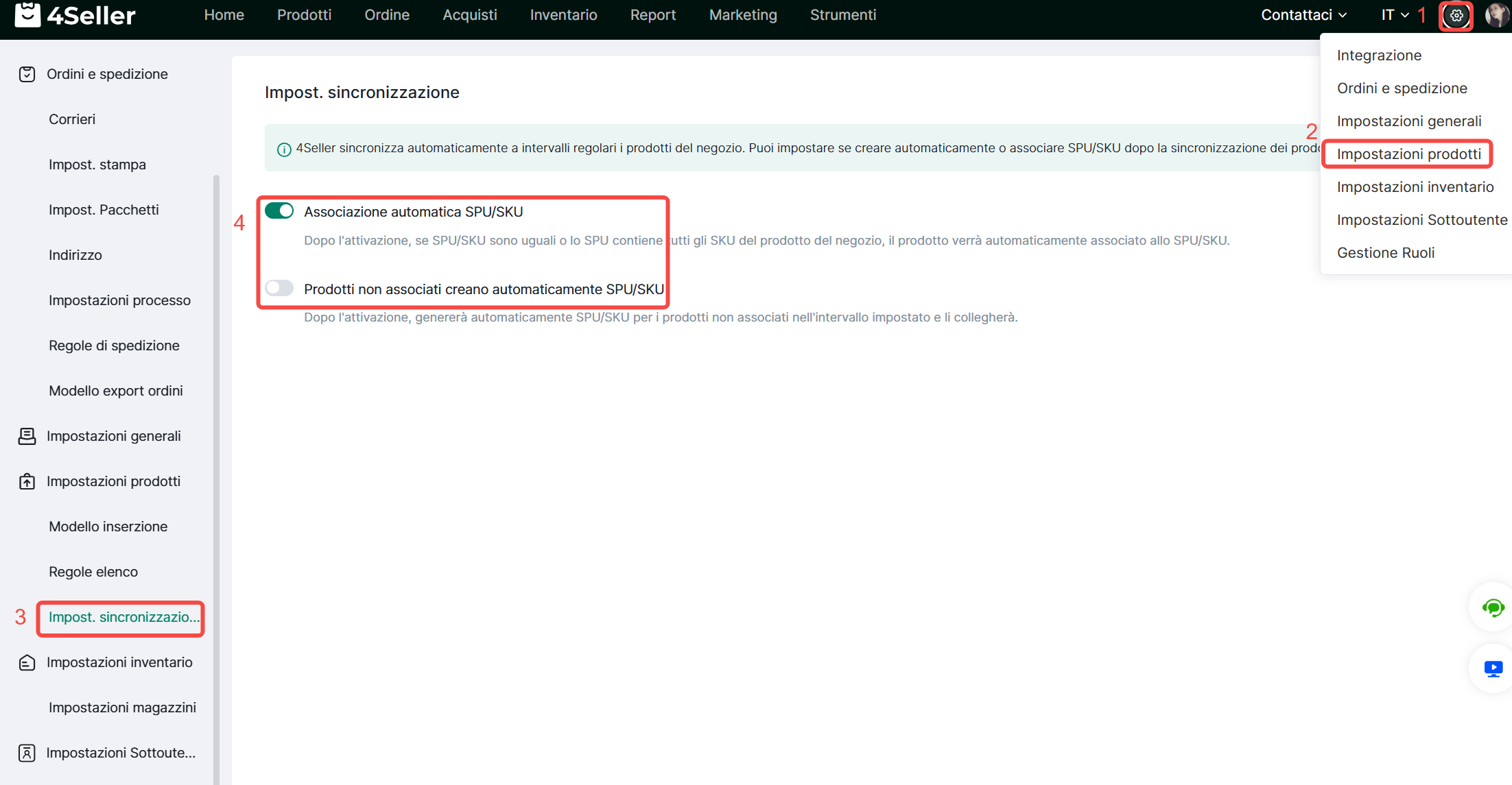 Per abilitare la funzione di sincronizzazione dell'inventario in 4Seller, è necessario prima completare le fasi di creazione dei prodotti, di abbinamento dell'MSKU del prodotto con lo SKU del prodotto e di aggiunta dello SKU dell'inventario per garantire che le regole di sincronizzazione dell'inventario impostate possano avere effetto e abilitare la funzione di sincronizzazione dell'inventario con successo.