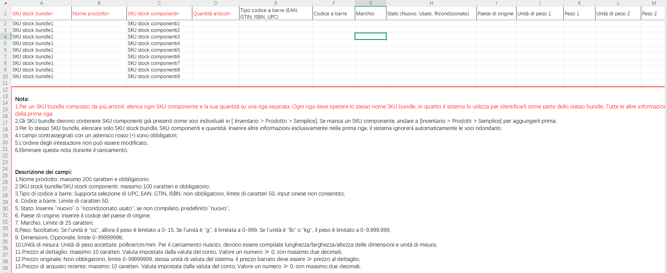 3. Le diverse versioni linguistiche corrispondono al modulo nella lingua relativa. Le versioni cinese e inglese condividono lo stesso modulo in inglese. Si prega di leggere gli esempi e le istruzioni prima di compilare.SKU combinato composto da più articoli deve essere compilato su più righe. Come mostrato nella figura sottostante