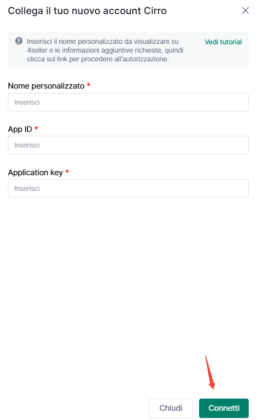 2、Inserire un nome personalizzato, recuperare APP ID e Application key dal pannello di controllo Cirro, quindi fare clic su Connetti.