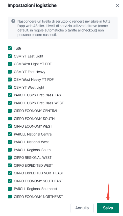 4、In Configurazione logistica, selezionare i servizi necessari e salvare. Sarà possibile scegliere il canale logistico corrispondente durante l'acquisto delle etichette per gli ordini successivi.