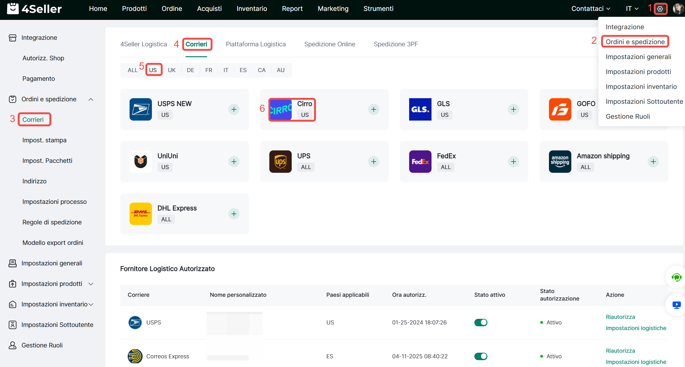 1、Fare clic su Impostazioni > Ordini e spedizione > Corrieri . Trovare l'icona Cirro e fare clic sul simbolo “+”.