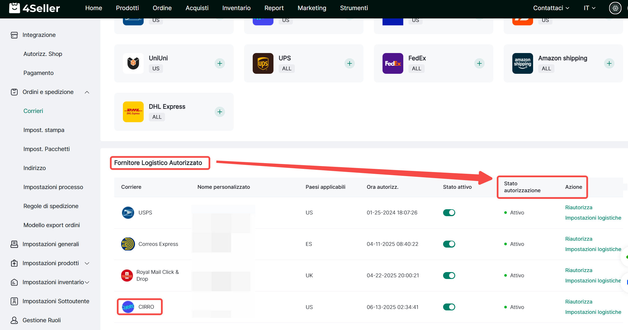 3、Dopo l'autorizzazione, verificare lo stato dell'autorizzazione tra i fornitori autorizzati: attivare/disattivare, riautorizzare o configurare i canali logistici.