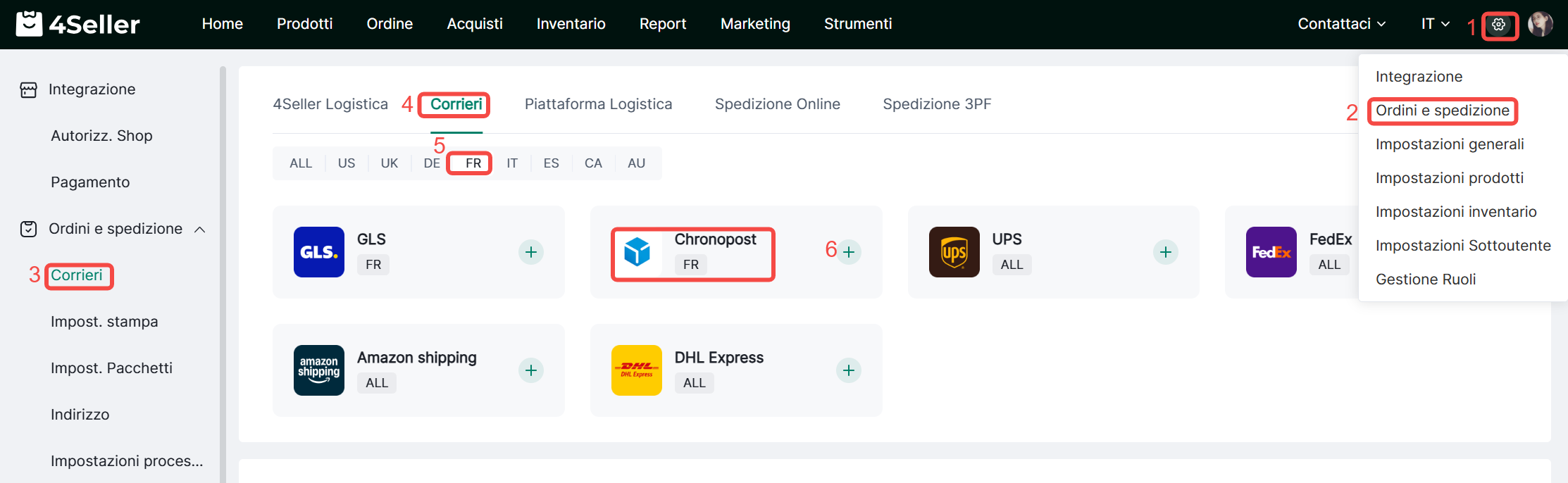 1、Clicca Impostazioni-Ordini & Spedizioni-Corrieri-Corrieri principali-Trova l'icona corrispondente -Clicca ‘+’.