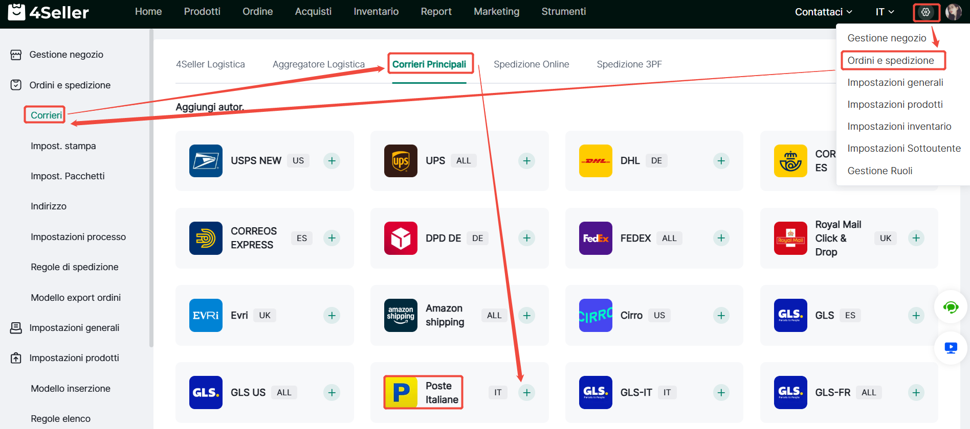 1. Fare clic su Impostazioni > Ordini e Spedizioni > Corrieri di Spedizione > Corrieri principali. Individua l'icona corrispondente e clicca su «+».