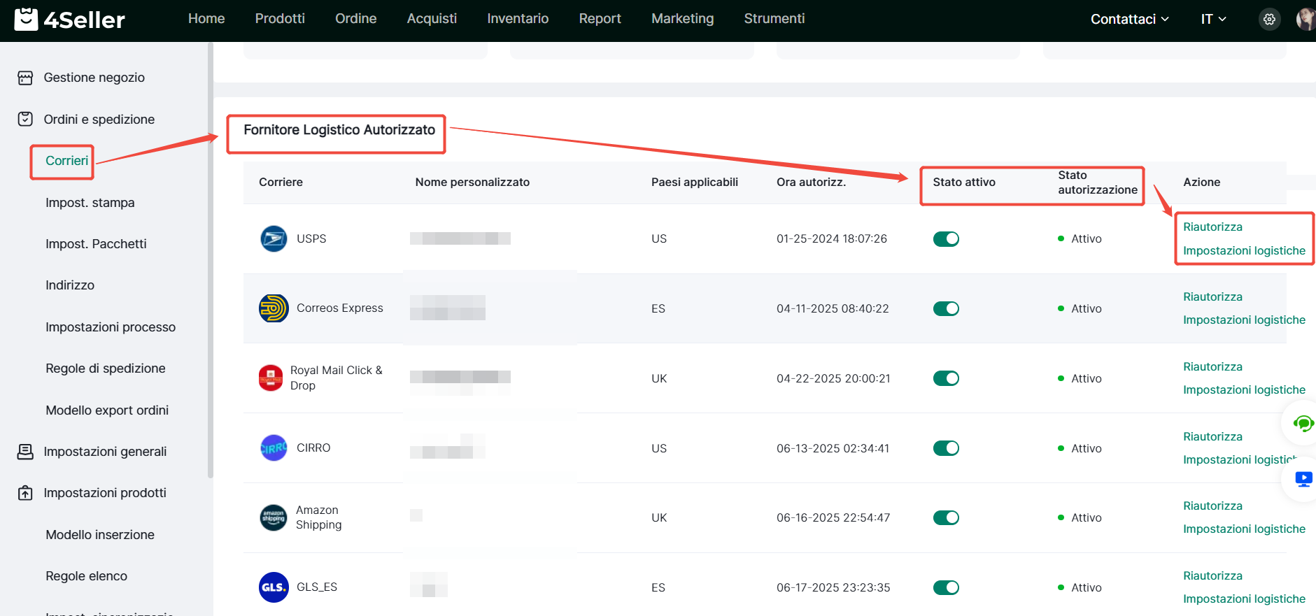 3. Dopo l'autorizzazione, potrai gestire il corriere qui: attivare/disattivare, riconfigurare autorizzazioni e impostare canali logistici.