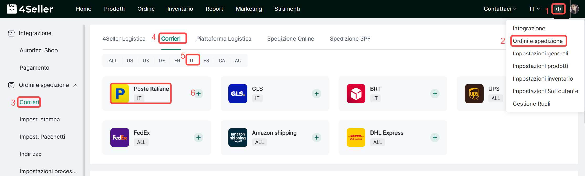 1. Fare clic su Impostazioni > Ordini e Spedizioni > Corrieri > Corrieri . Individua l'icona corrispondente e clicca su «+».