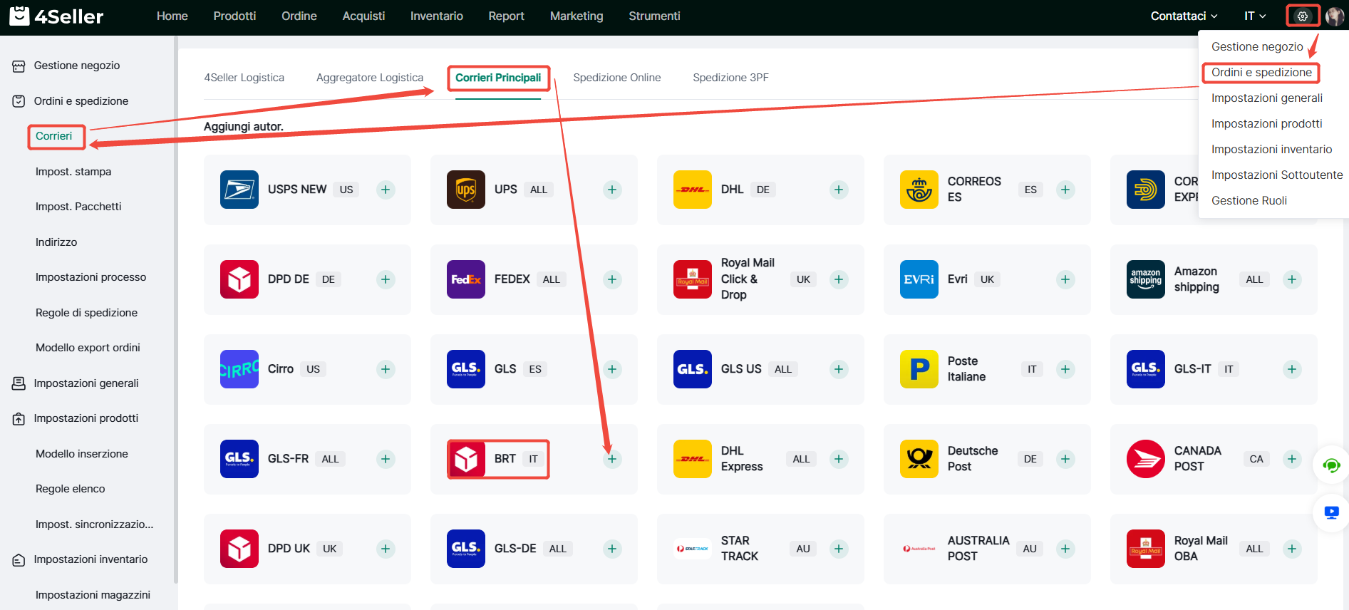1、Clicca Impostazioni-Ordini & Spedizioni-Corrieri di Spedizione-Principali Corrieri Pacchi-Trova l'icona corrispondente-Clicca ‘+’.