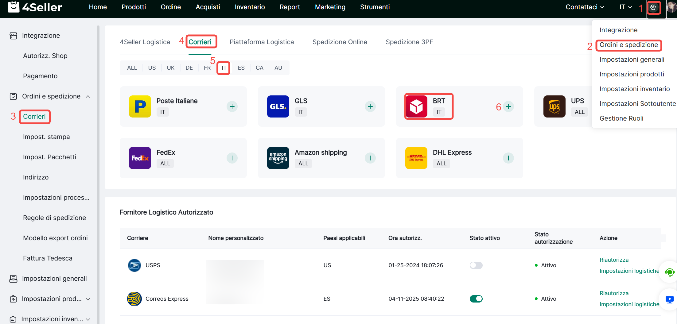 1、Clicca Impostazioni-Ordini & Spedizioni-Corrieri di Spedizione- Corrieri - Corrieri-Trova l'icona corrispondente-Clicca ‘+’.