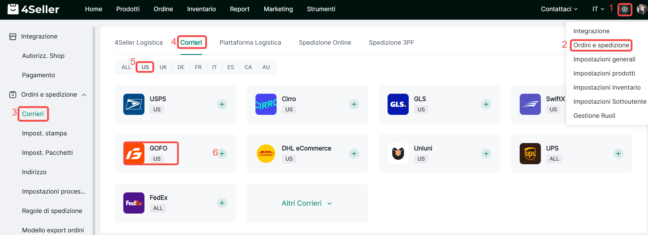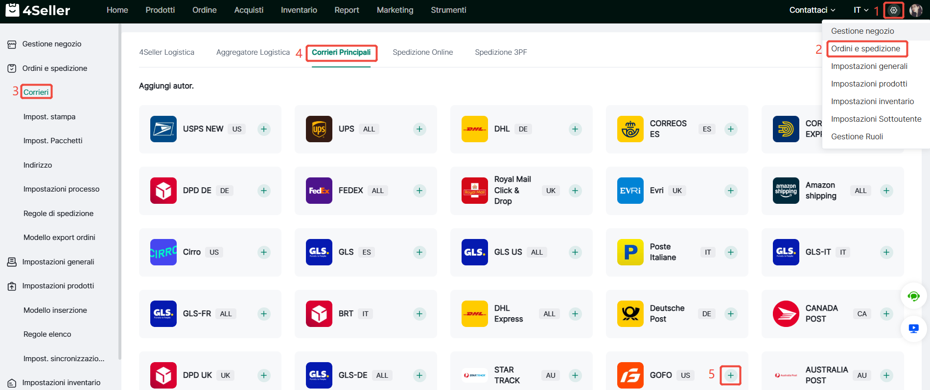 1、Clicca su Impostazioni-Ordini & Spedizioni-Corrieri-Corrieri Principali-Trova l'icona corrispondente e clicca ‘+’.