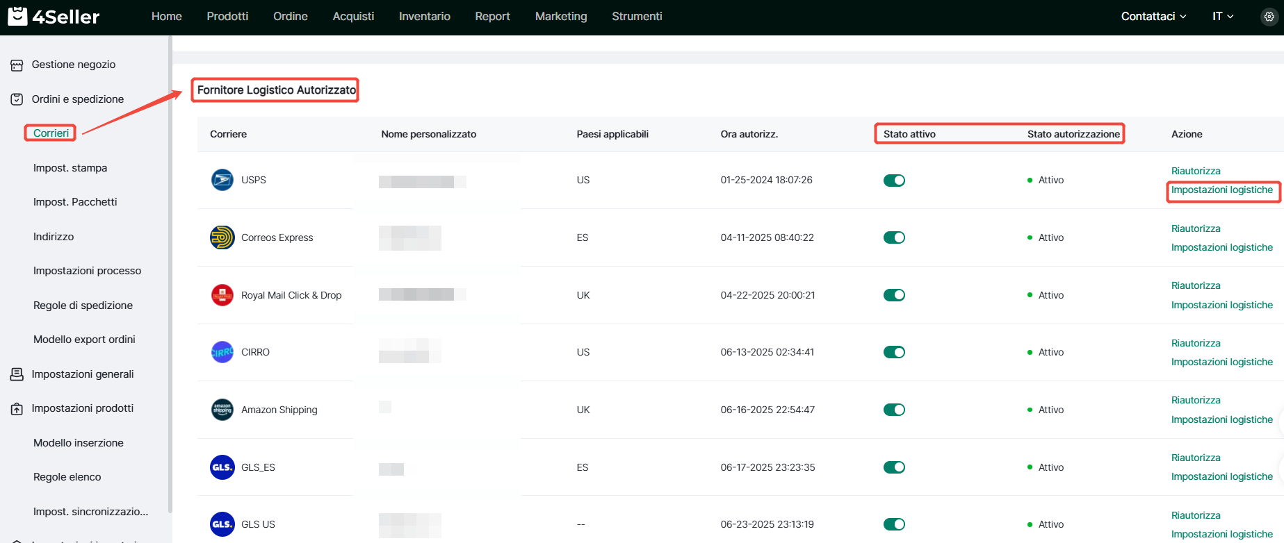 3、Dopo l'autorizzazione, gestisci i corrieri abilitati tramite attivazione, riconnessione o impostazioni avanzate.
