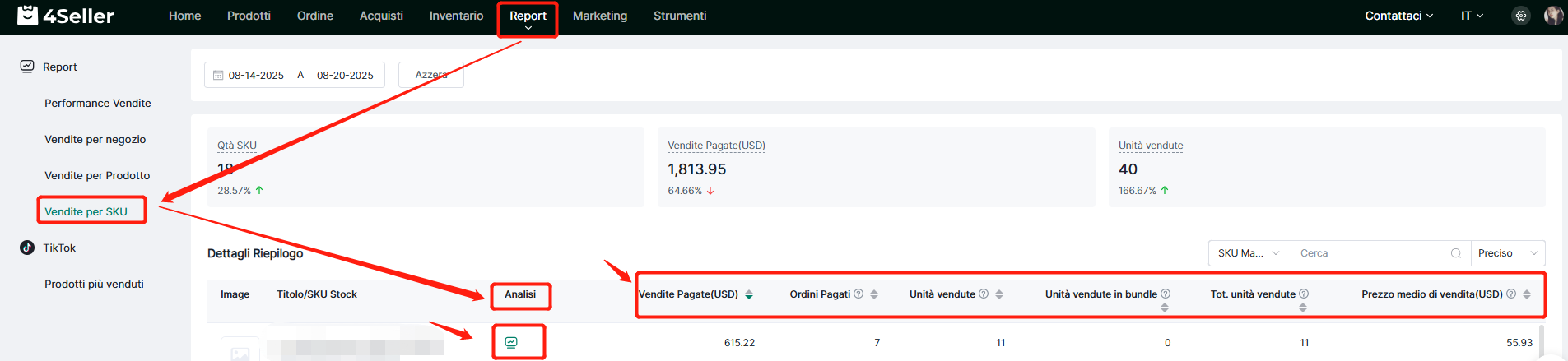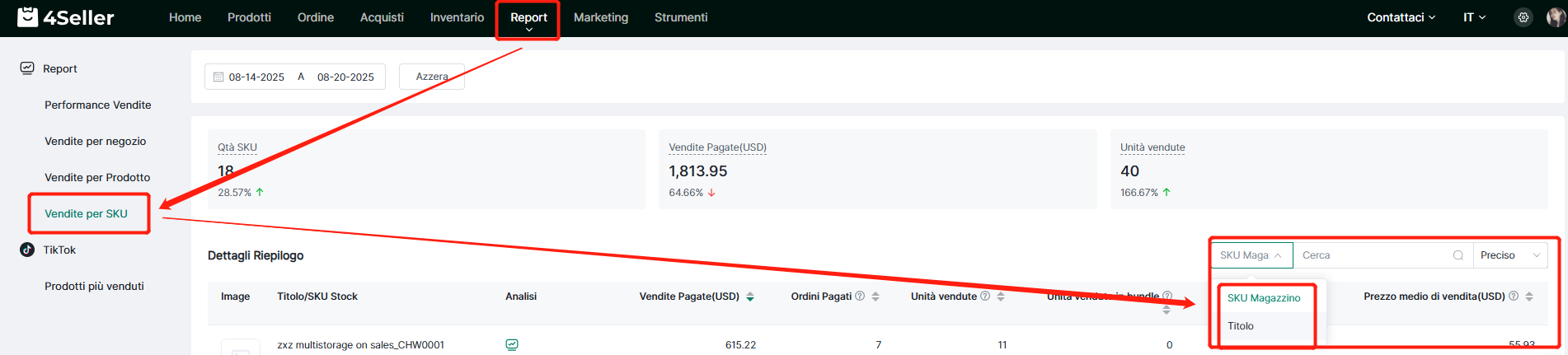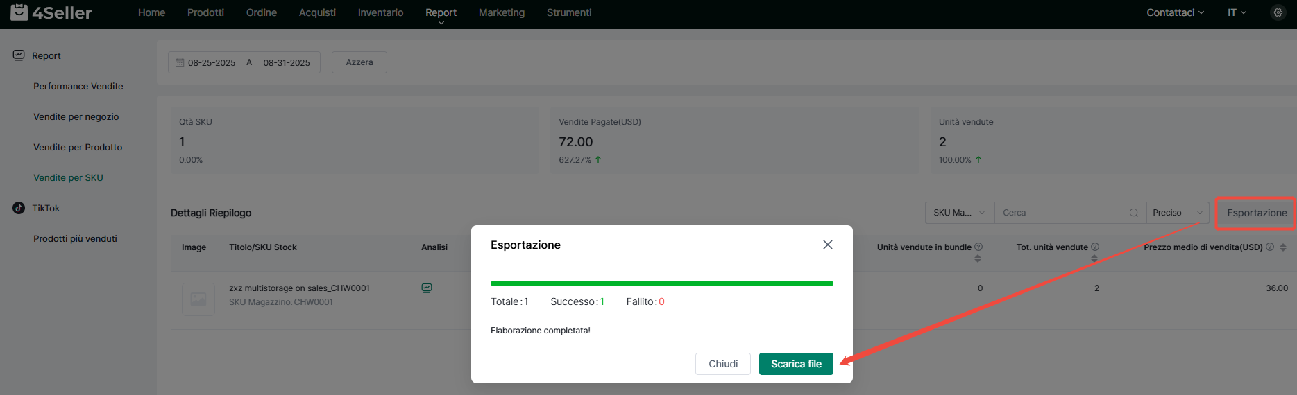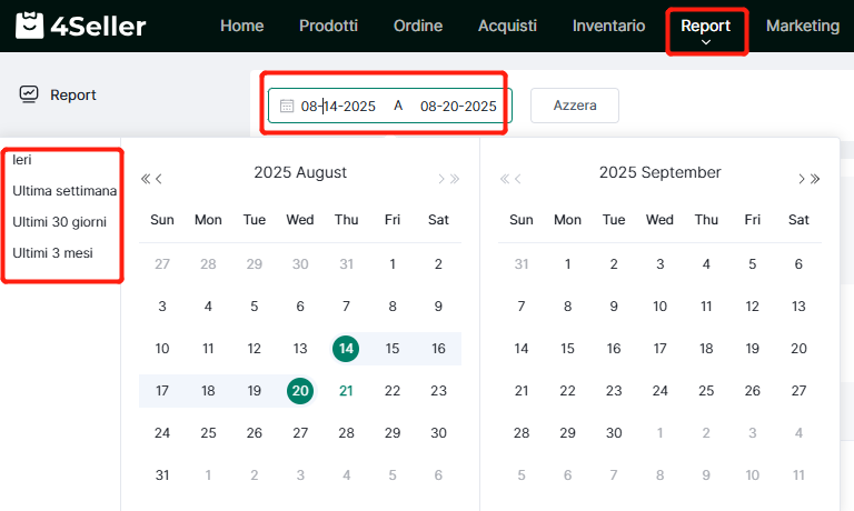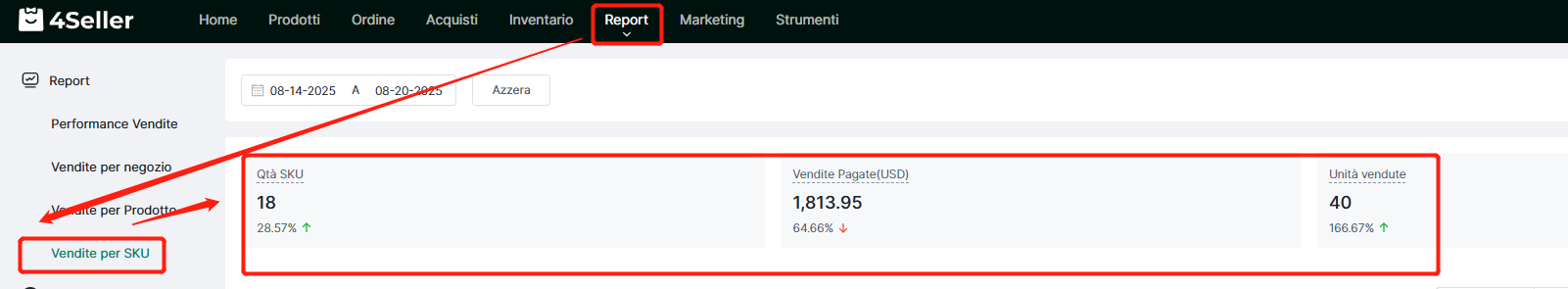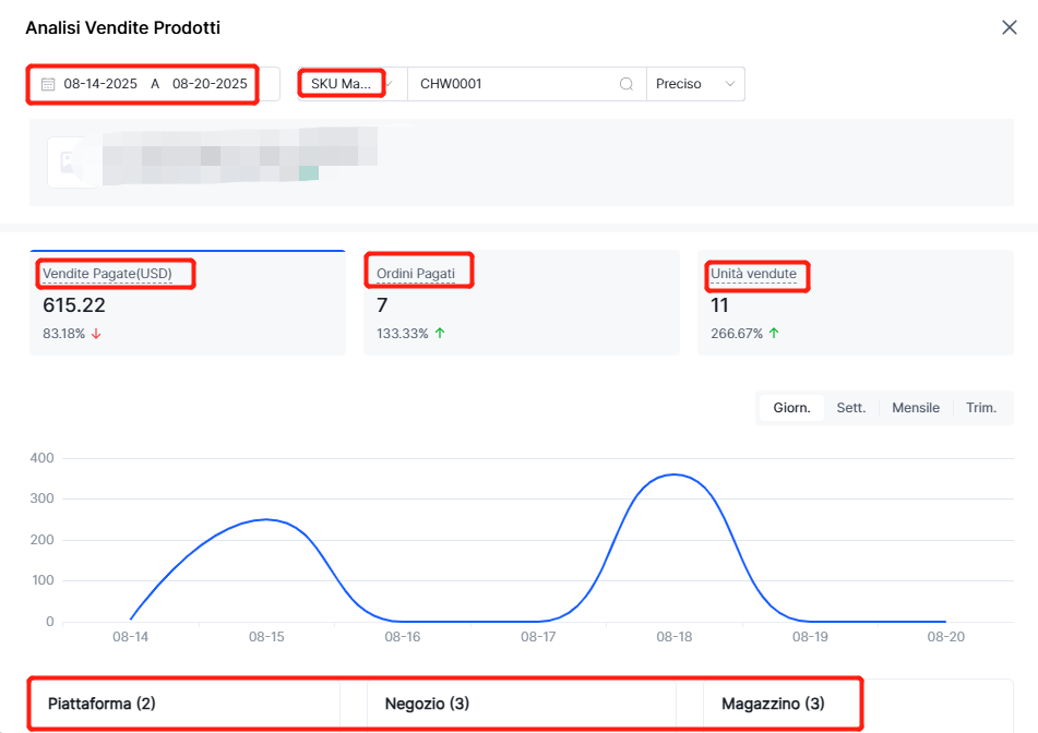 Nota: I prerequisiti per le statistiche di vendita SKU sono: (1) l'ordine è stato spedito(spedizione da 4Seller); (2) il sistema ha attivato il decremento scorte all'invio; (3) se è un ordine diviso, le statistiche vengono calcolate solo dopo la spedizione dell'intero ordine (tutti i colli).