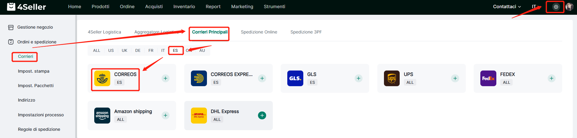 Passo 1: Vai su Impostazioni - Ordini & Spedizioni - Corrieri - Corrieri principali - ES - Seleziona CORREOS ES - Clicca su “+”.