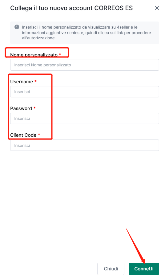 Passo 2: Inserisci i dati richiesti nella finestra pop-up e clicca su Connetti