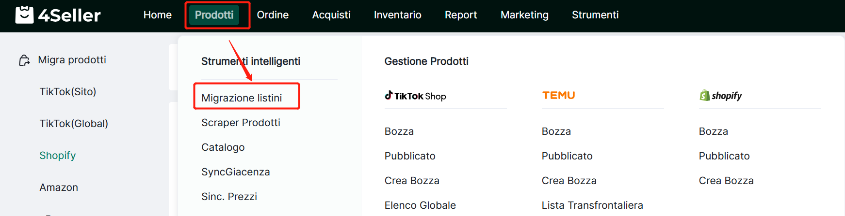 Accesso 1: Prodotti > Migrazione listini > seleziona la piattaforma di origine > accedi alla pagina di migrazione
