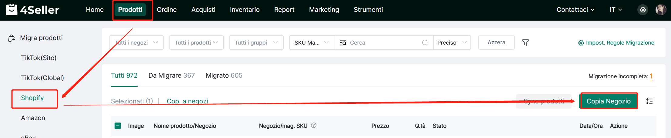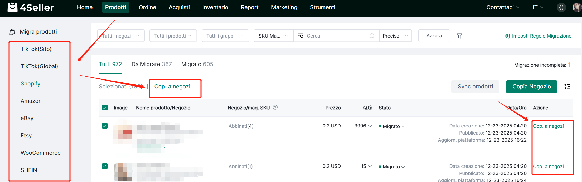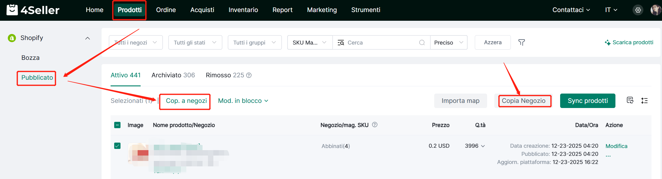 In 4Seller, i prodotti con stato "Pubblicati" in Shopify, Amazon, TikTok, Shein, eBay, Etsy, WooCommerce possono essere sincronizzati con il negozio Amazon tramite "Cop. a negozi" e "Copia Negozio"!