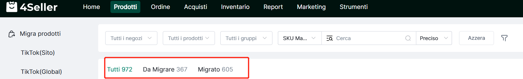 2. "Da migrare" significa che i prodotti non sono stati migrati in precedenza in altri negozi.