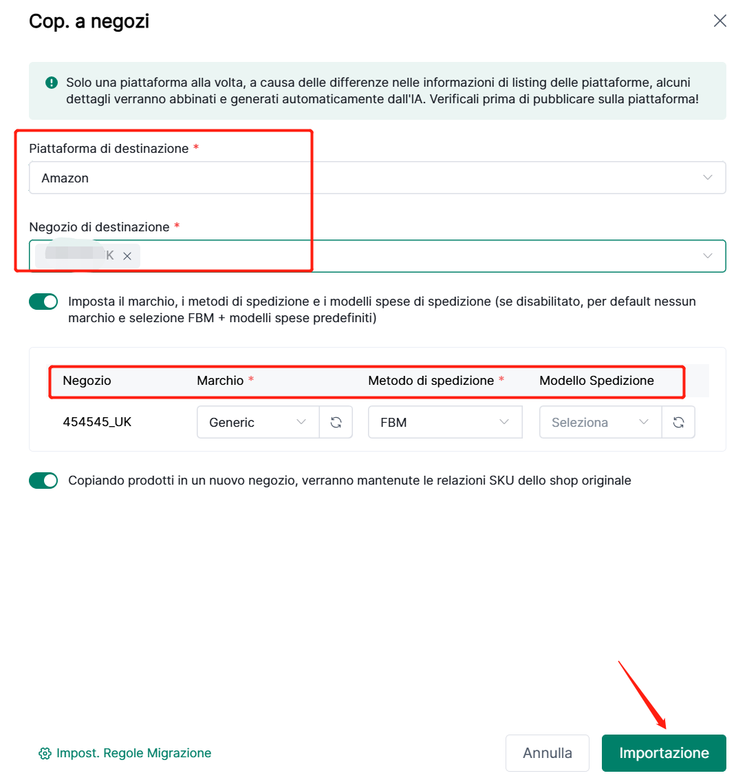 1. Seleziona la piattaforma Amazon e i negozi di destinazione.