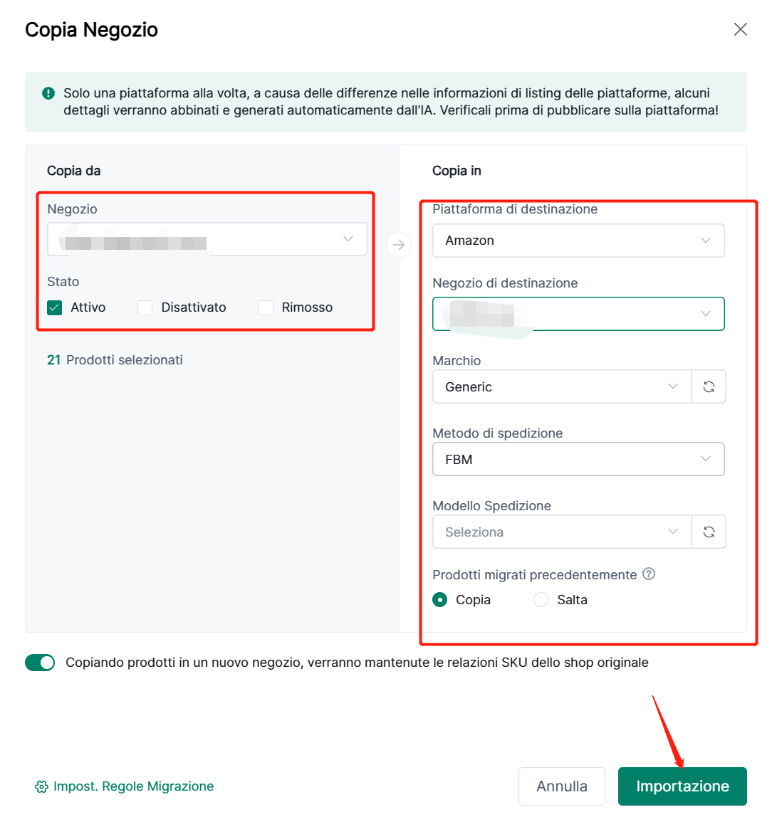 2. Scegli Marketplace Amazon e i negozi destinatari.