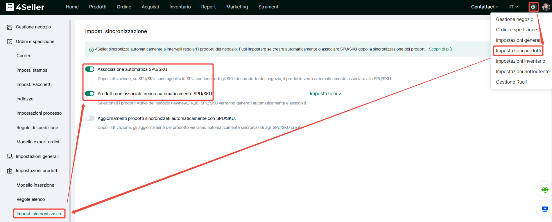 Dopo aver autorizzato il tuo negozio, attiva queste due impostazioni per abilitare l'associazione e la creazione automatiche. Ciò richiede che il prodotto della piattaforma abbia uno SKU del negozio. Se la piattaforma non dispone di uno SKU del negozio, gli SKU di inventario non verranno generati automaticamente. È necessario creare manualmente singoli SKU di inventario. Consulta l'articolo di help: Come creare gli SKU?
