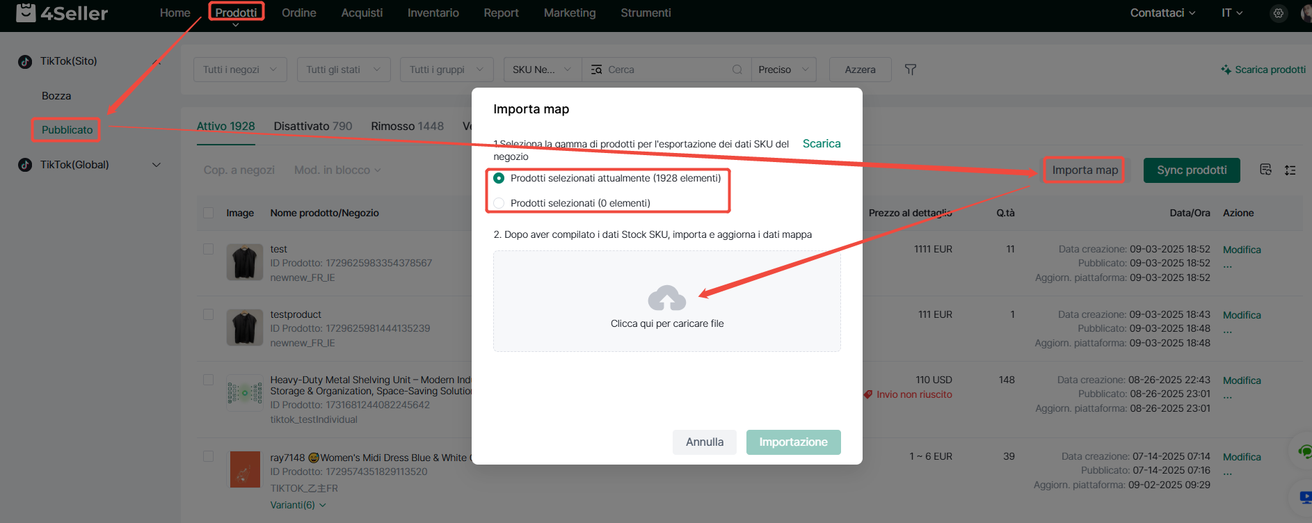 I prodotti pubblicati sincronizzati dalle piattaforme possono essere associati in batch tramite "Importa mappa". Durante l'importazione, puoi selezionare l'intervallo di prodotti per esportare i dati dello SKU del negozio: i prodotti attualmente filtrati o i prodotti selezionati.