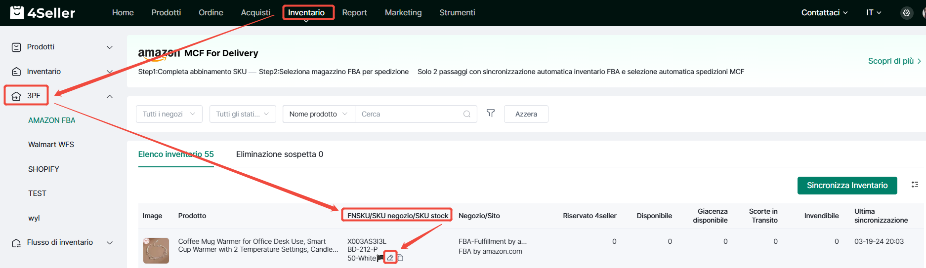Gli SKU di magazzino di terze parti possono essere abbinati/modificati nella pagina Inventario.