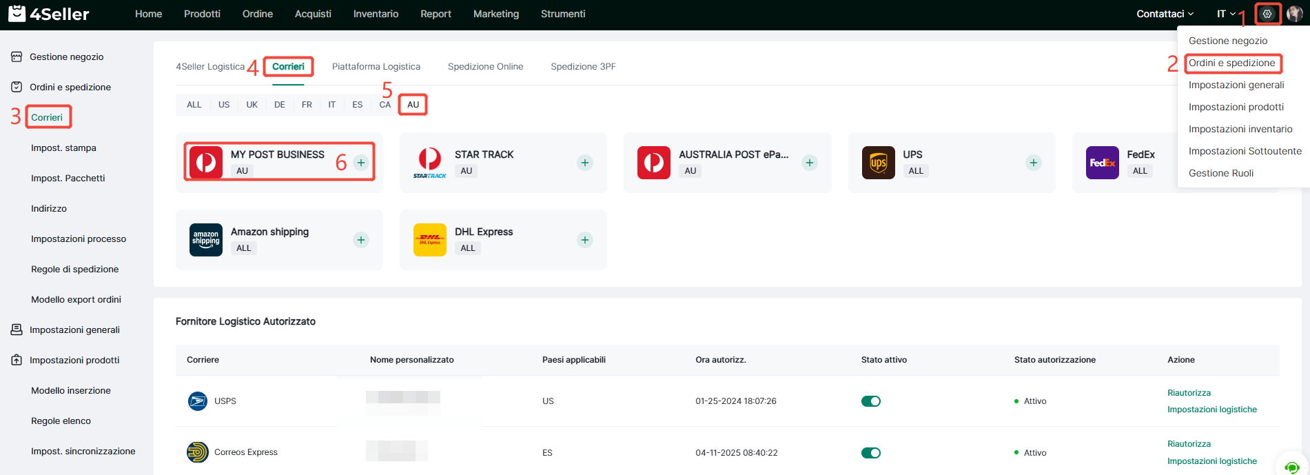1. Clicca su Impostazioni - Ordini & Spedizioni - Corrieri - Trova l'icona corrispondente - Clicca ‘+’.