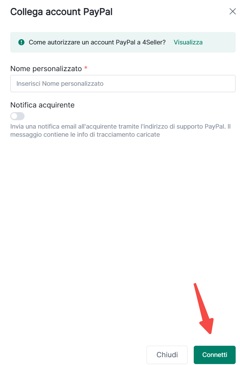 Passo 2: Nome cliente--Seleziona se attivare "Notifica acquirente" (Se attivato, invierà una email di notifica all'acquirente con i dettagli di tracking)--Clicca "Connetti"