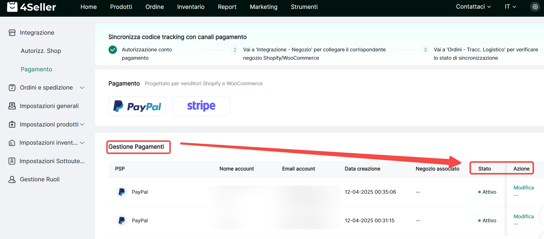 Passo 5: Impostazioni--Pagamento--Gestione pagamenti--Controlla stato & modifica & elimina & riconnetti
