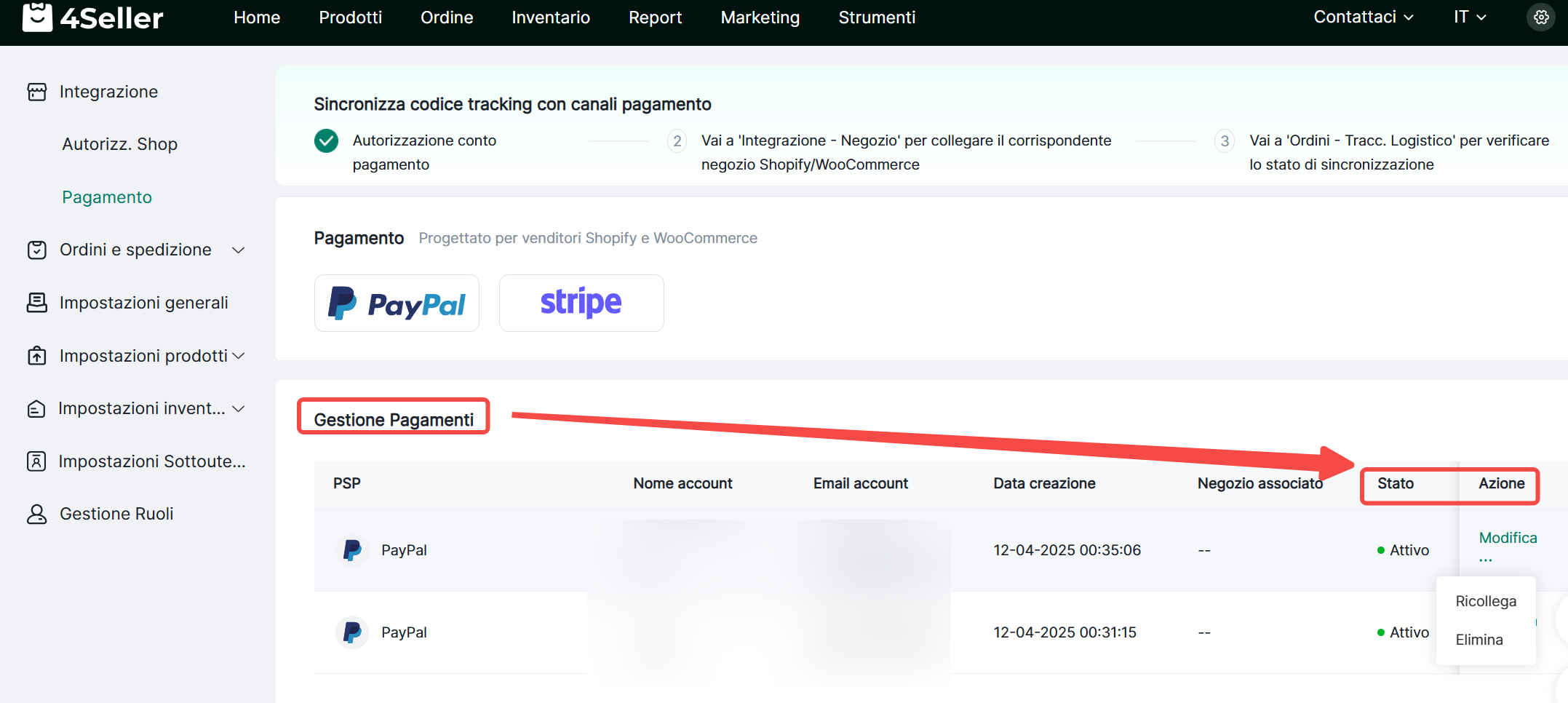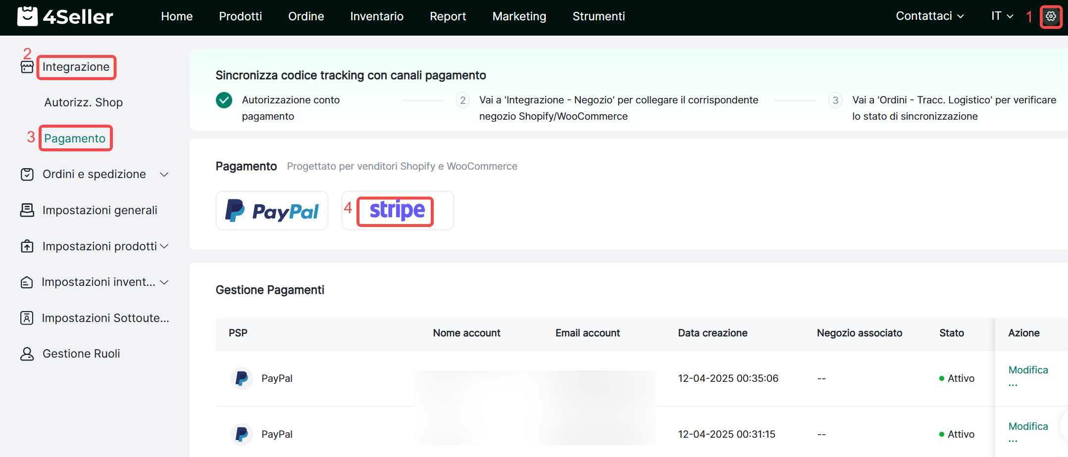 Passo 8: Impostazioni 4Seller--Integrazione--Pagamento--Clicca "Stripe"
