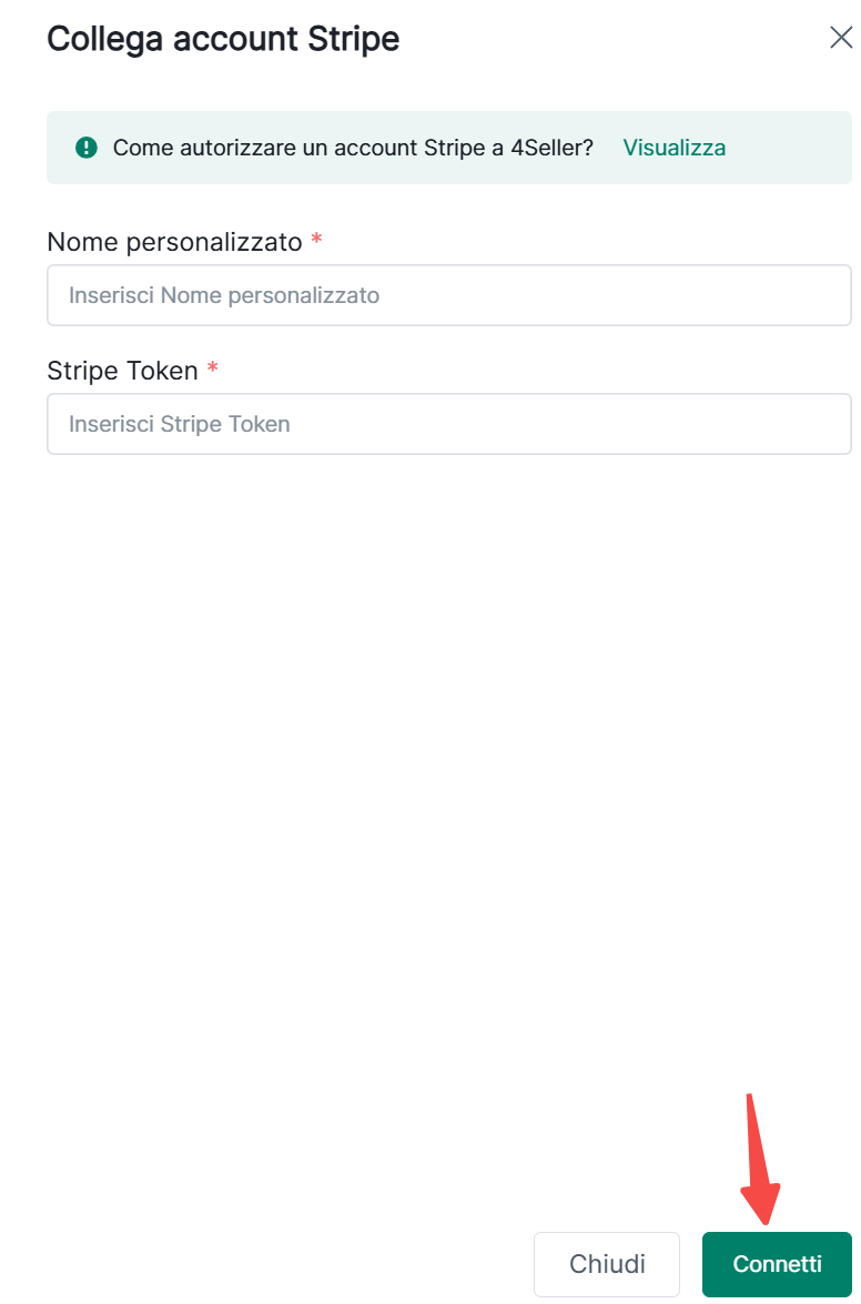 Passo 9: Personalizza Nome--Inserisci il token Stripe--Clicca "Connect"