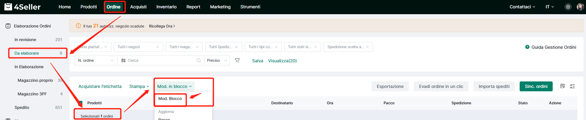 Passo 1: Ordini--Da Spedire--Seleziona ordini in blocco da modificare--Clicca "Modifica Blocco"