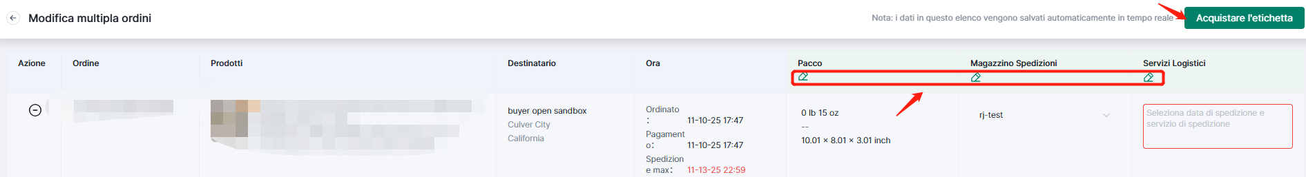 Passo 2: Seleziona la modifica in blocco di pacco, magazzino di spedizione e servizio logistico--Clicca "Acquista Etichetta"