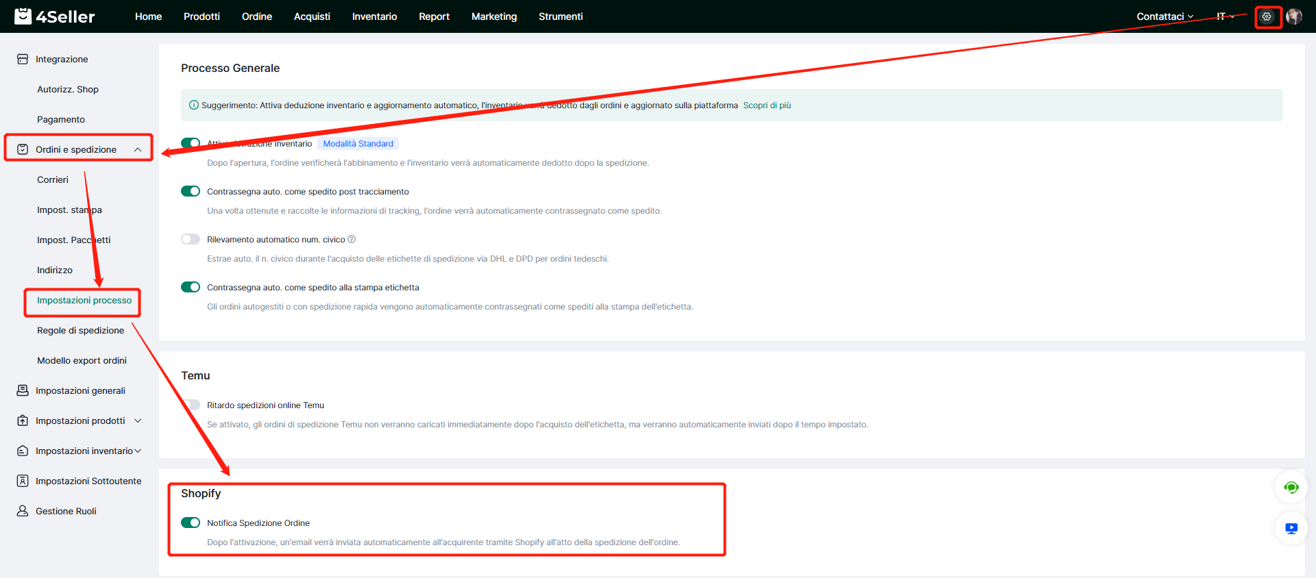 4Seller supporta la configurazione delle notifiche di evasione degli ordini Shopify agli indirizzi email degli acquirenti. Procedura: Impostazioni → Impostazioni Processo → Shopify → Notifica Spedizione Ordine