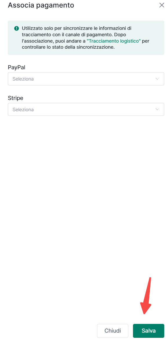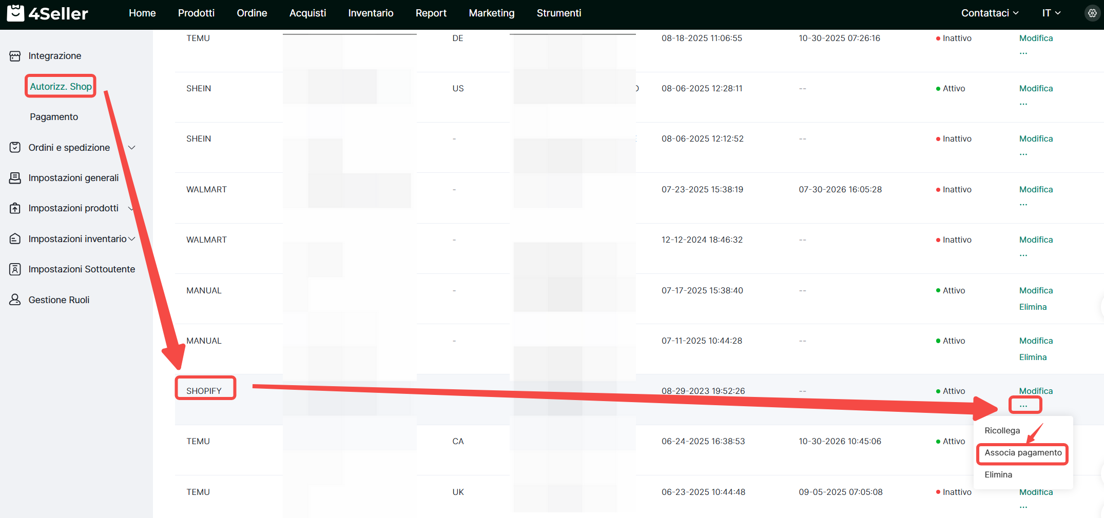 Passo 2: Impostazioni > Integrazioni > Negozi > Seleziona Shopify/Woocommerce > Associa pagamento
