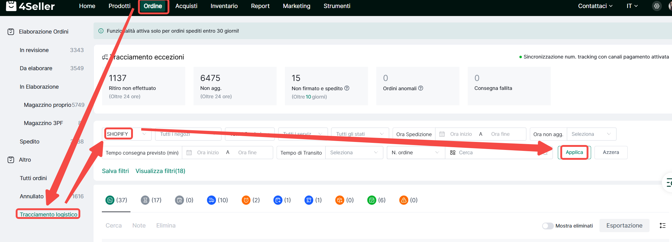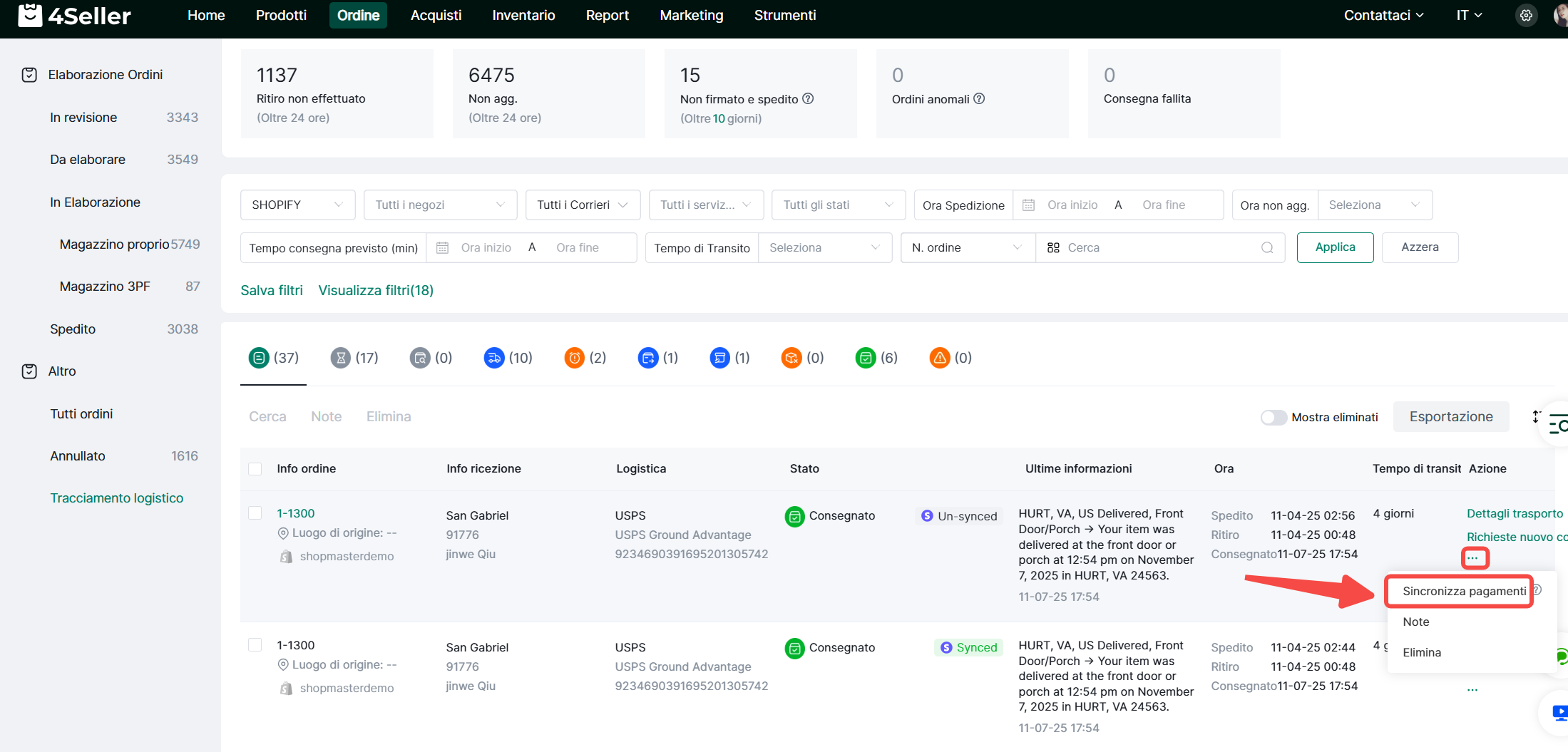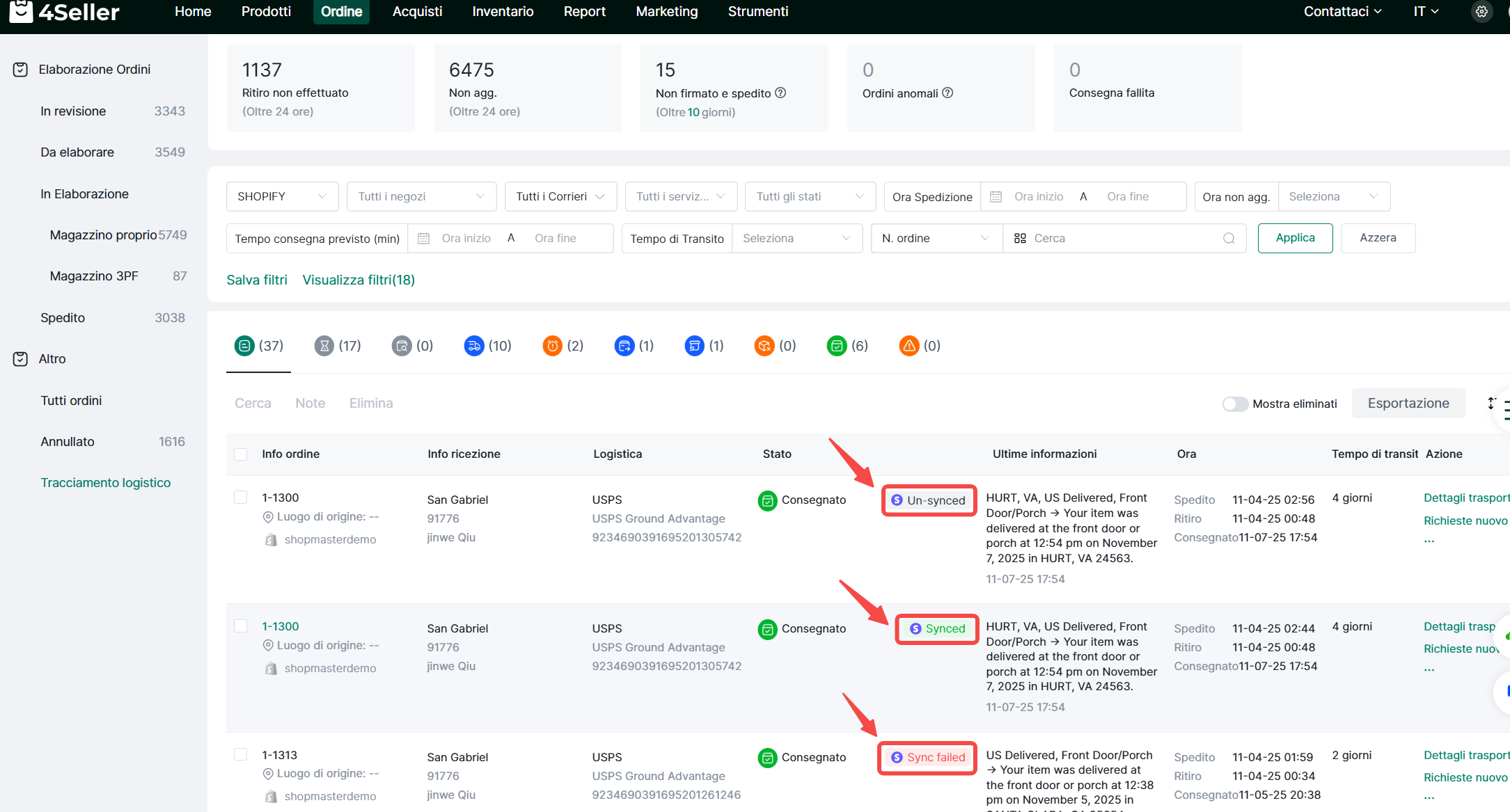 Passo 4: Ordini > Tracking Logistico > Filtra per negozio > Verifica stato sincronizzazione
