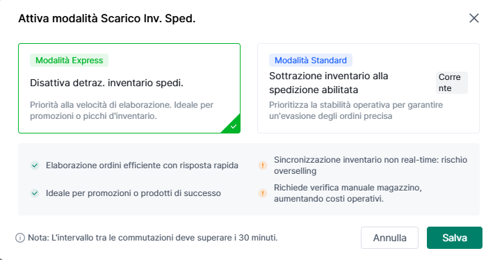 Modalità Express è scorte meno spedizioni chiuso. Questa opzione è ideale per utenti che privilegiano la velocità di elaborazione. Ottimale per promozioni o periodi di picco delle scorte.