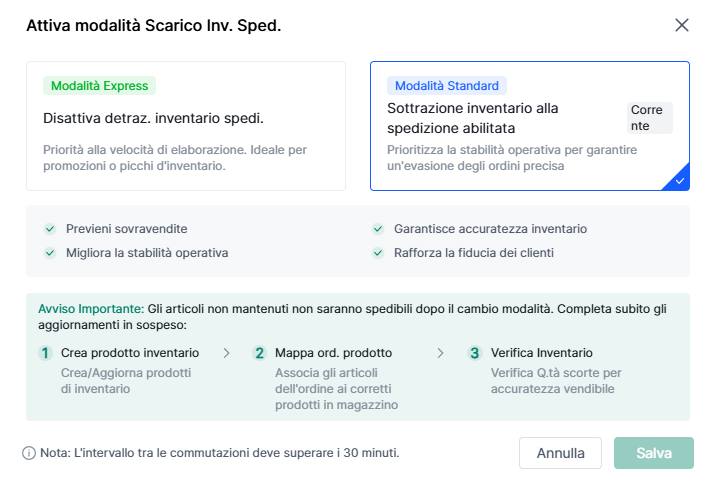 Modalità Standard è scorte meno spedizioni aperto, adatta a utenti che privilegiano la stabilità operativa per garantire un evasione ordini accurata