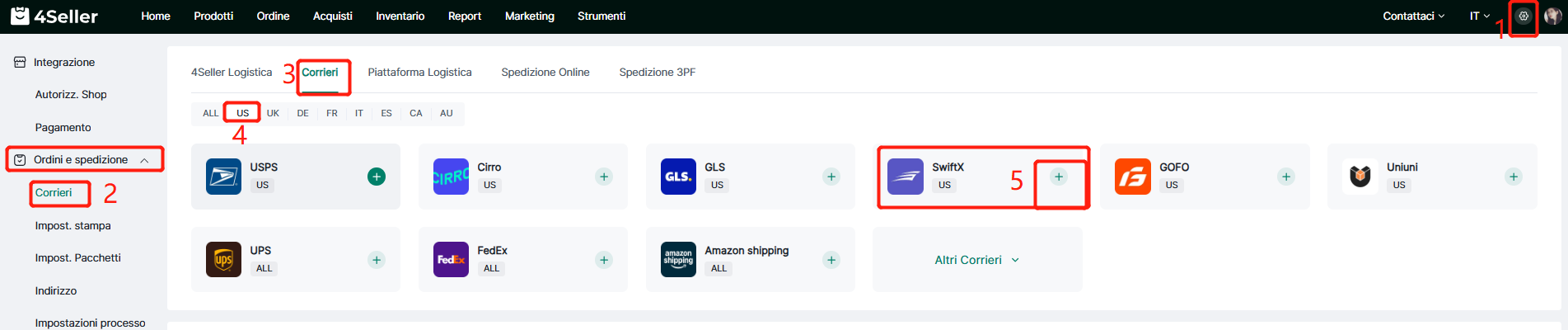 Passo 1: Impostazioni--Ordini e spedizione--Corrieri--US--SwiftX
