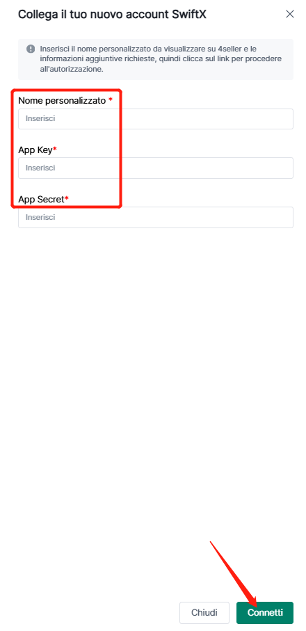 Passo 2: Inserisci nome cliente--Contatta l'Assistenza SwiftX per ottenere App Key & App Secret--Clicca "Conectti"
