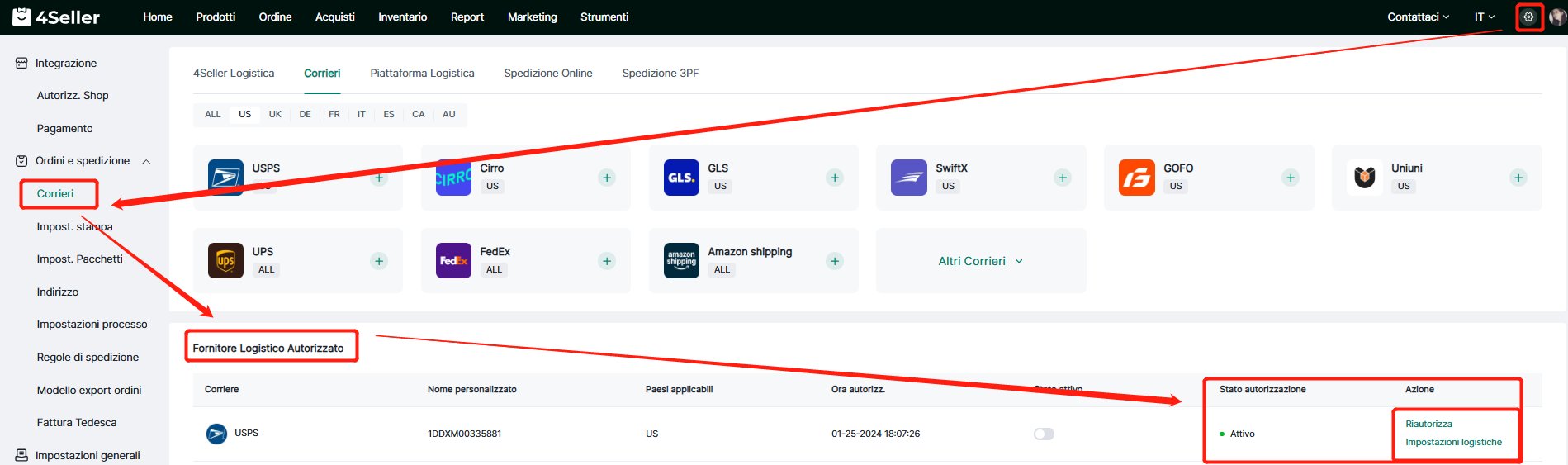 Passo 3: Dopo la connessione, verifica lo stato autorizzato in "Fornitori di Logistica Autorizzati"